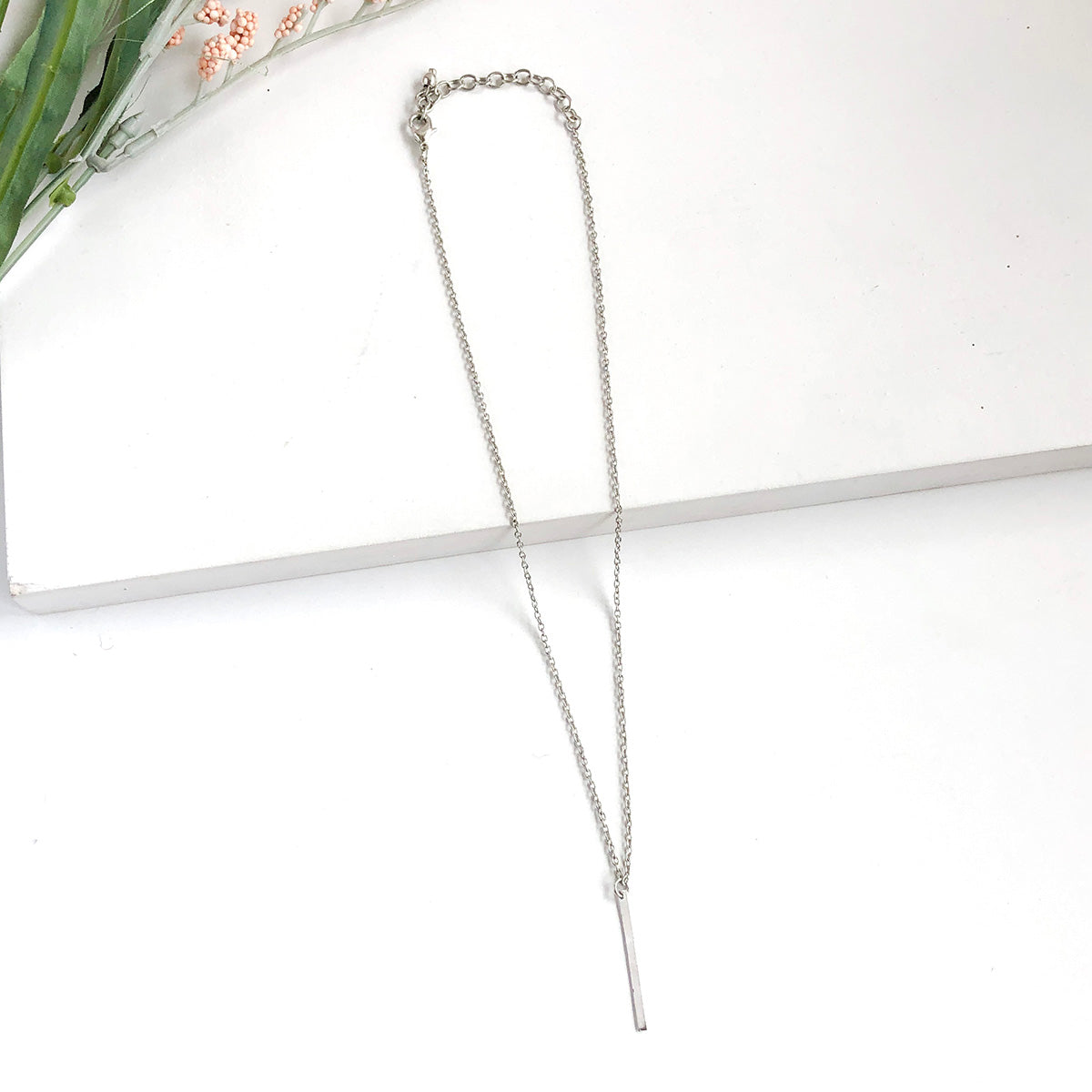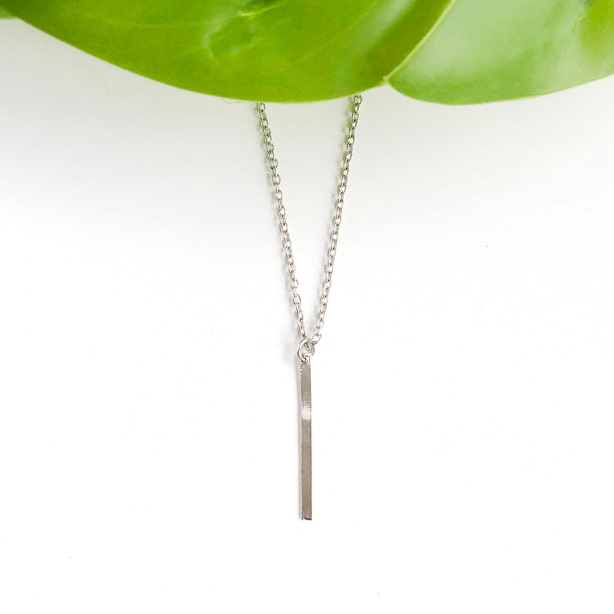 A single matte metal vertical bar dangles from a delicate chain to create a classic, elegant look. Layer with longer pieces for an on-trend look.