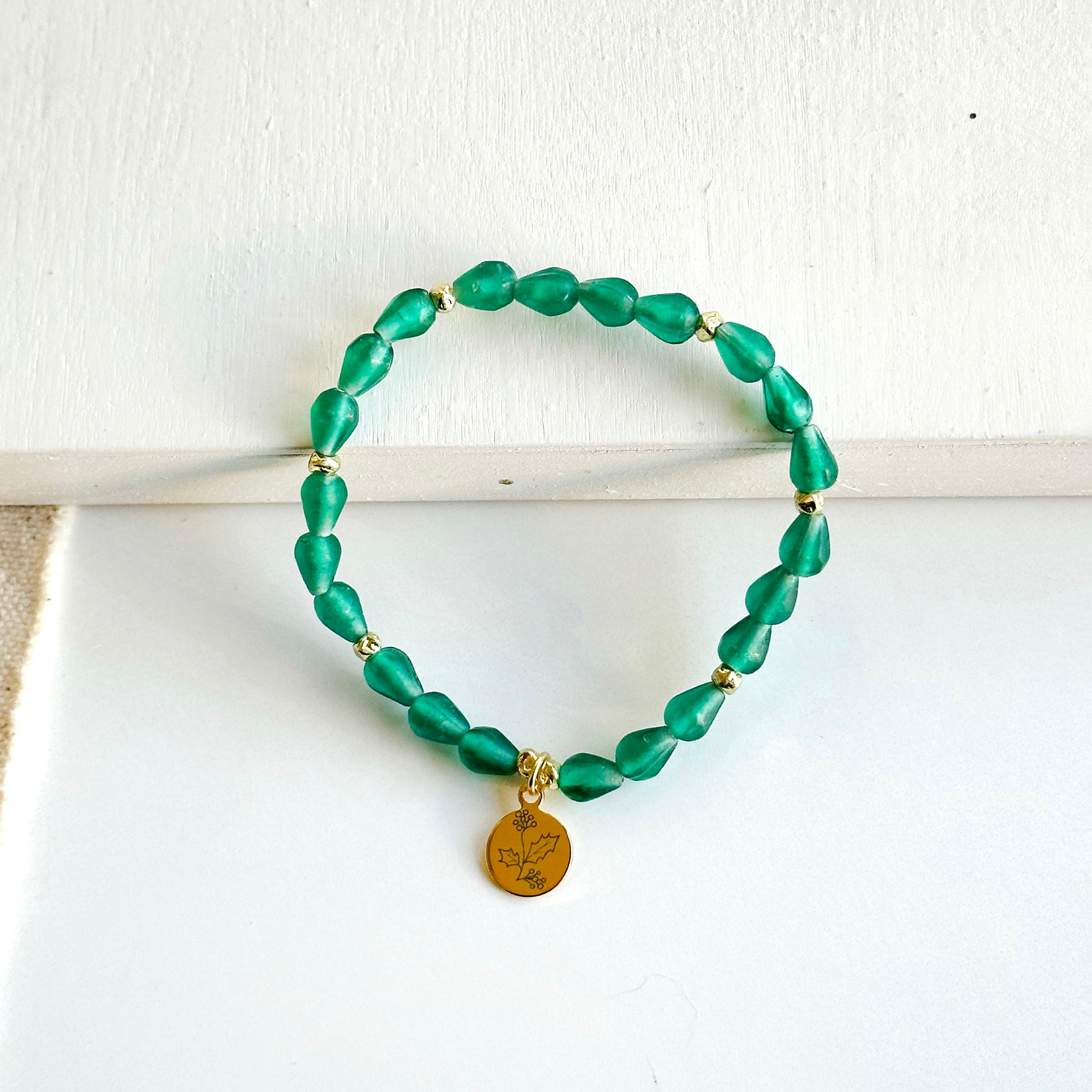 Hello, December! š² Part of our Botanical Collection, the December Bracelet is crafted from rich green glass beads, brass accent beads, and features a holly charm. Great for gifting, the card features the holly and it's symbols of merriment, abundance and optimism, along with a garden-inspired quote.This bracelet also benefits an urban community garden project!