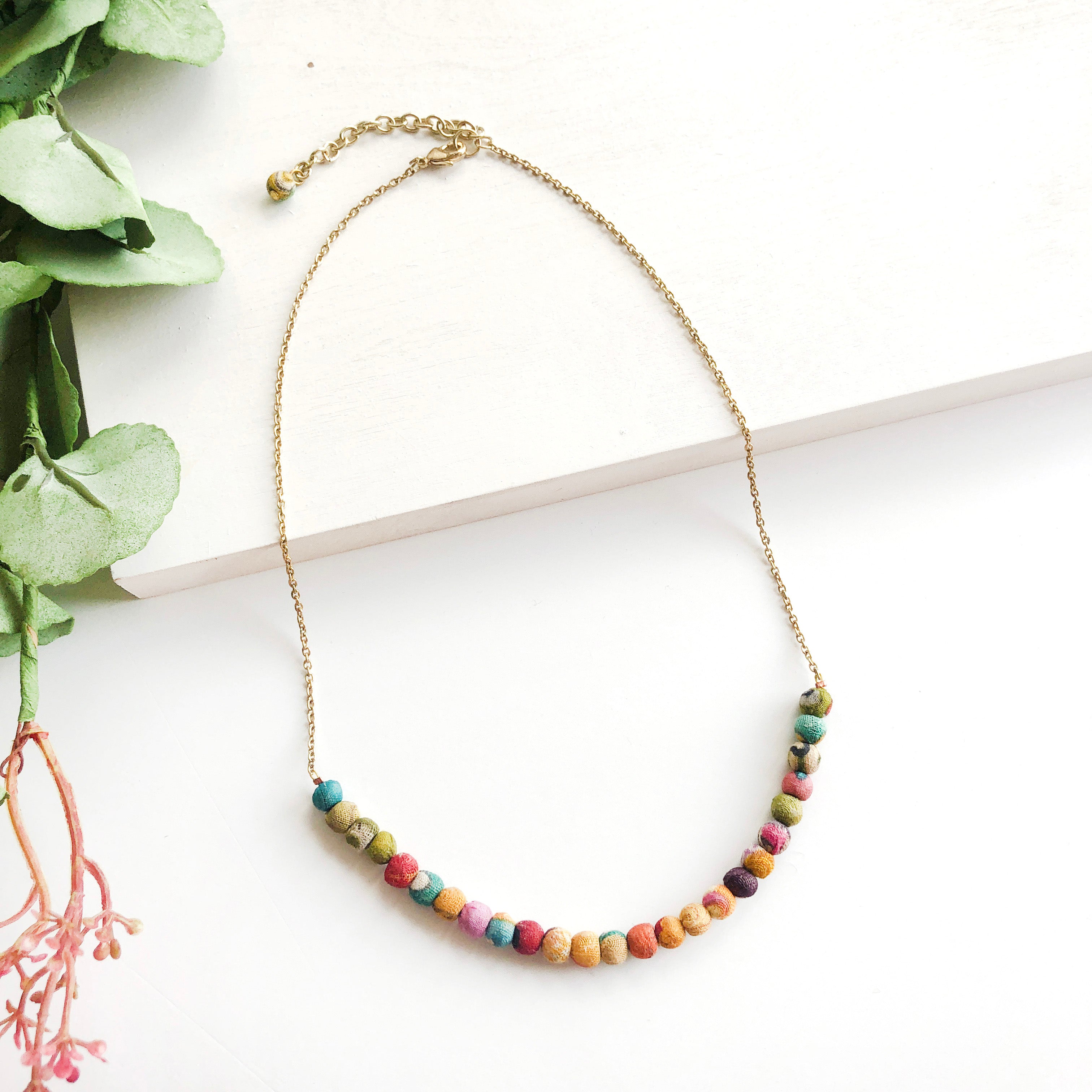A single strand of colorful, repurposed textile beads decorates a delicate gold metallic chain to create this simple style. Perfect for layering.