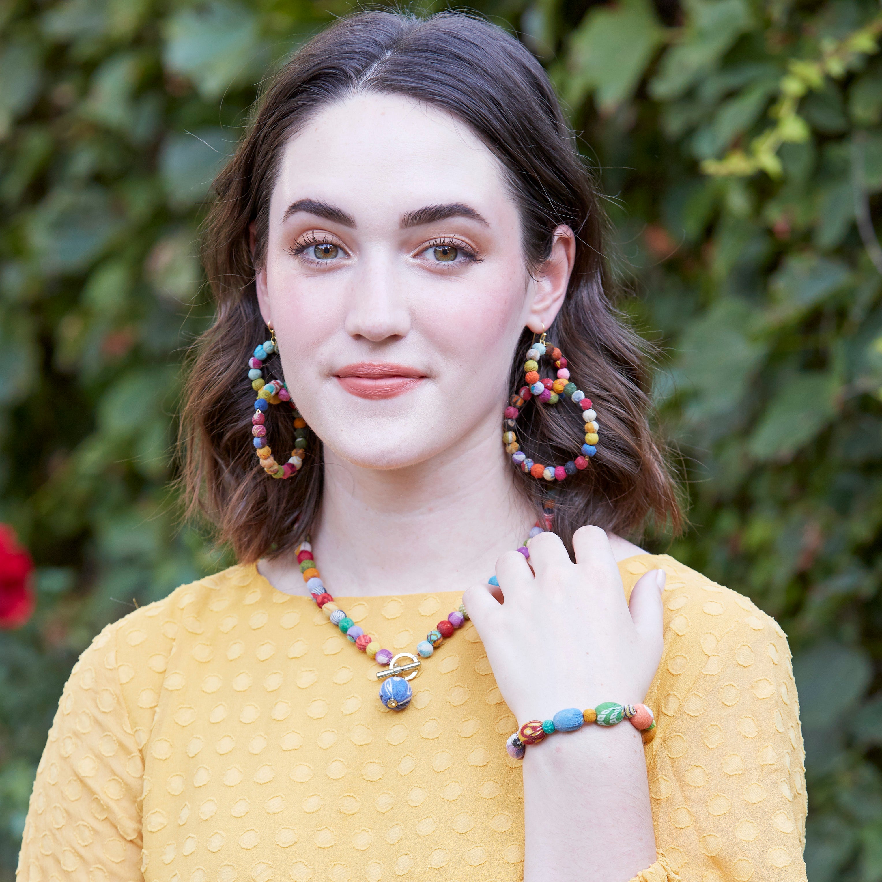 Vibrant oval beads come together with small round beads to create this playful design. Crafted from recycled textiles, the kantha beads are all one-of-a-kind and colors vary.