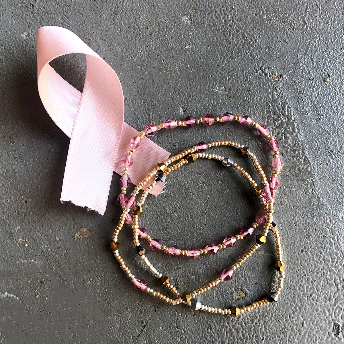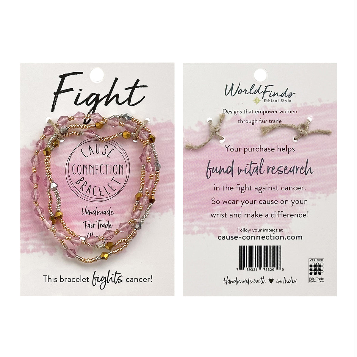 Ideal for Breast Cancer Awareness Month, The Fight bracelet creates goodness on so many levels! Each three-stranded bracelet is not only handmade by women artisans in India, but it also provides funds for vital research in the fight against cancer. See below for more information on this donation! Beads are made of glass and a brass/metal mix.