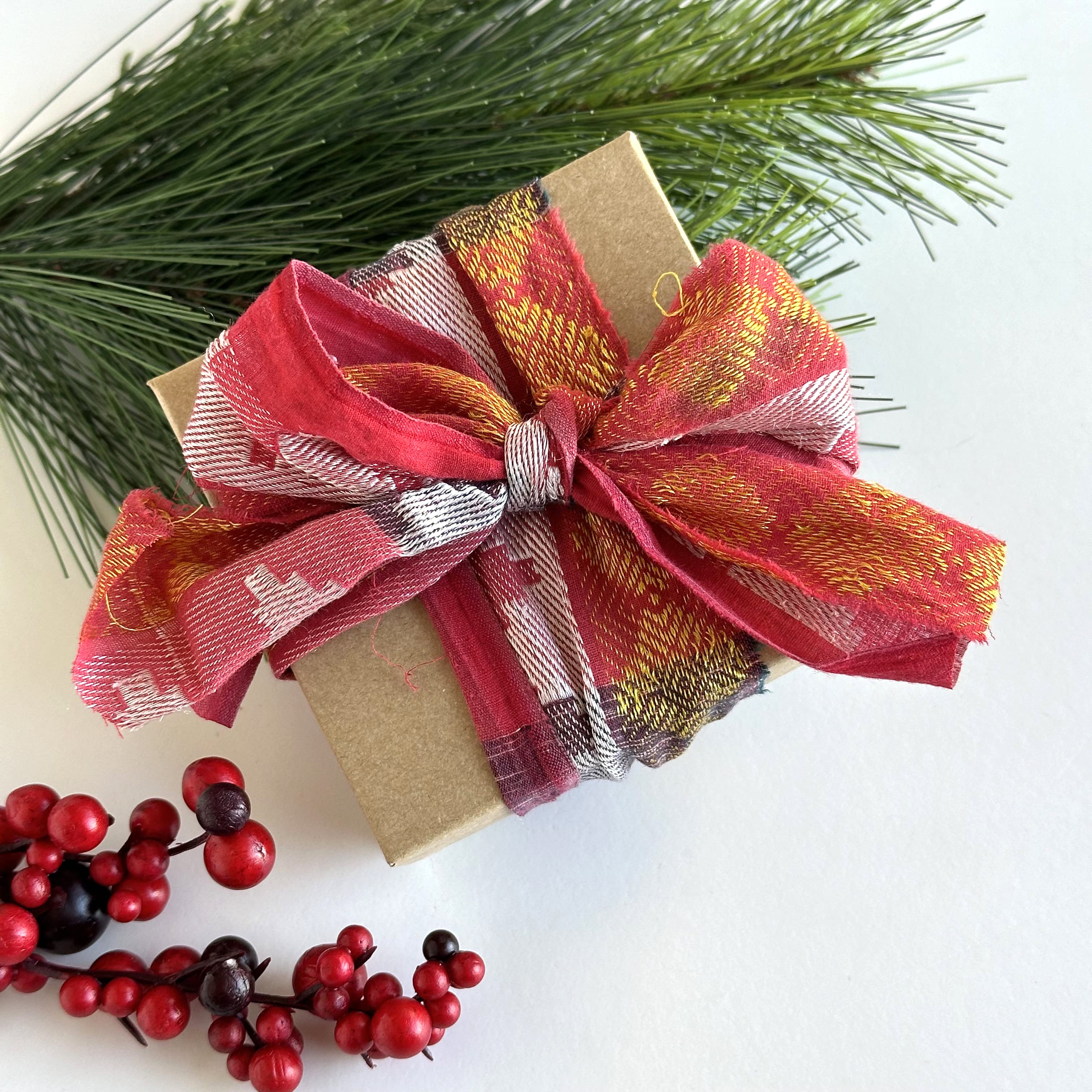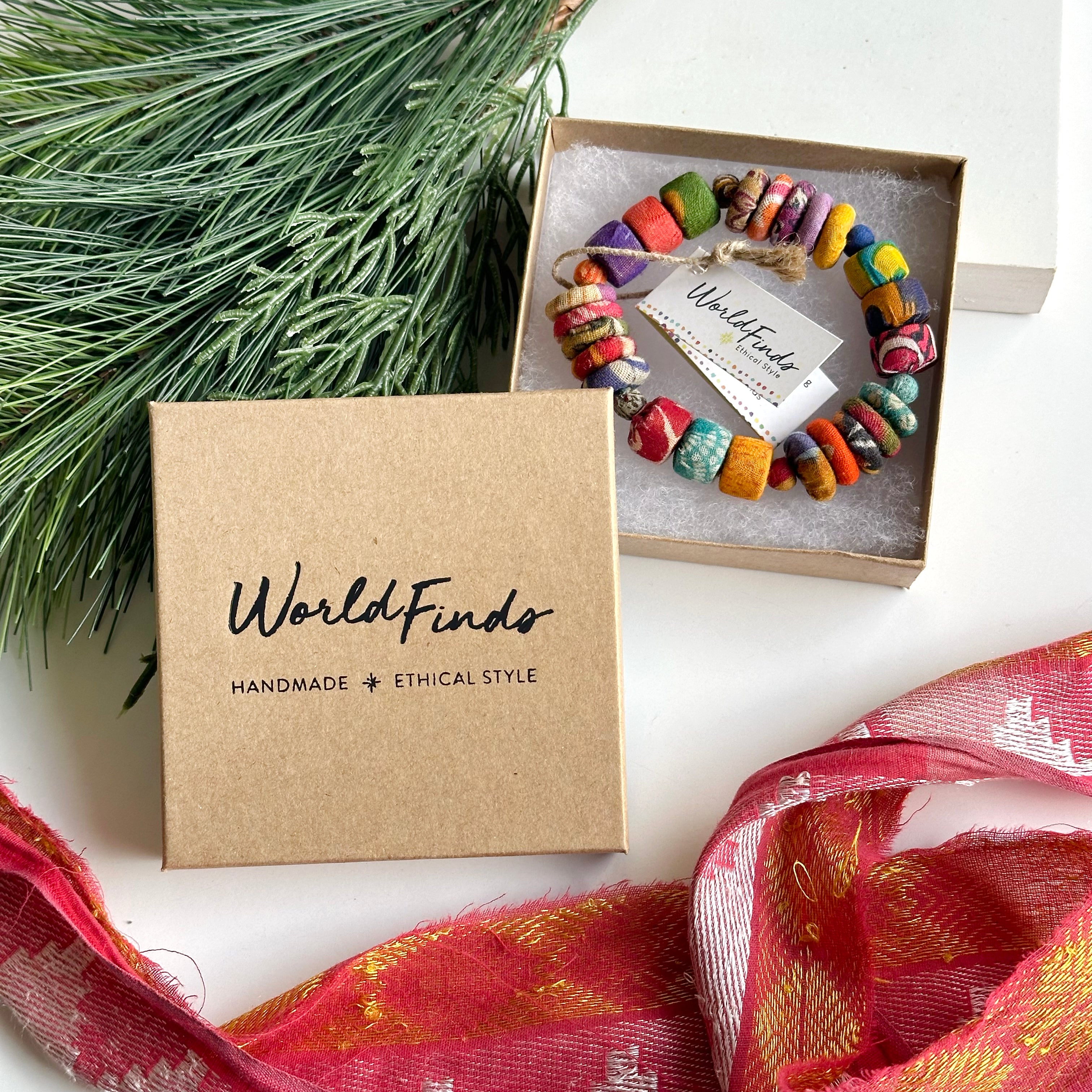 Each box is wrapped with an upcycled Sari "ribbon" and is filled with removable cotton padding.