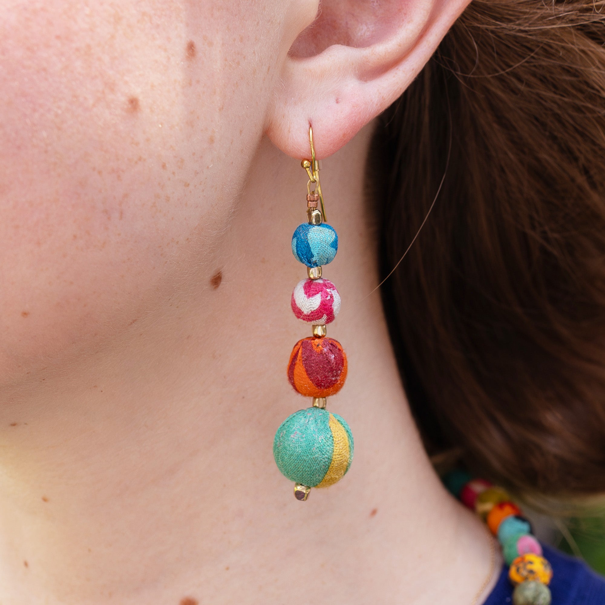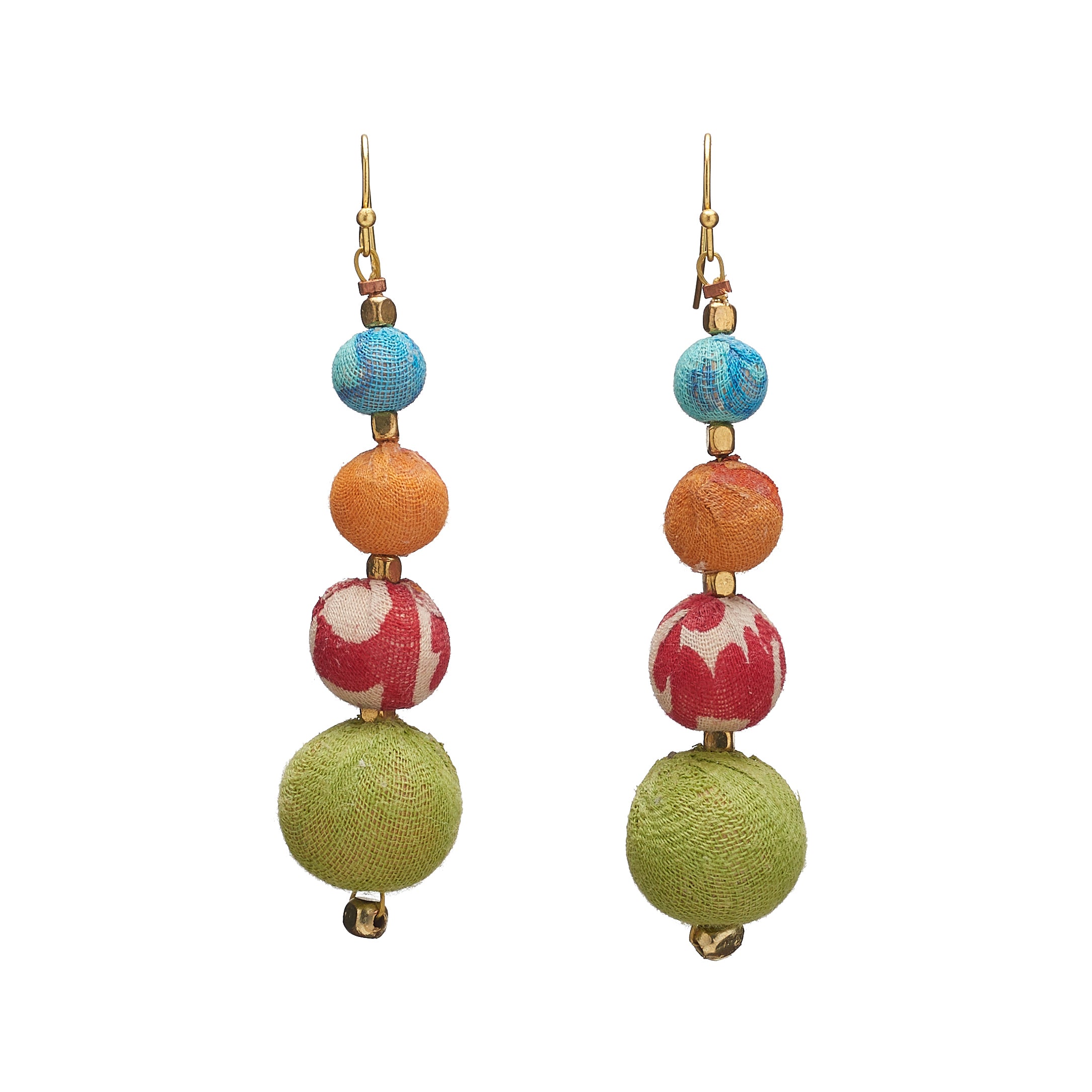 Add an elegant and colorful flair to your look with the Graduated Kantha Earrings. Four repurposed fabric beads gradually increase in size to create this simple yet dramatic look.