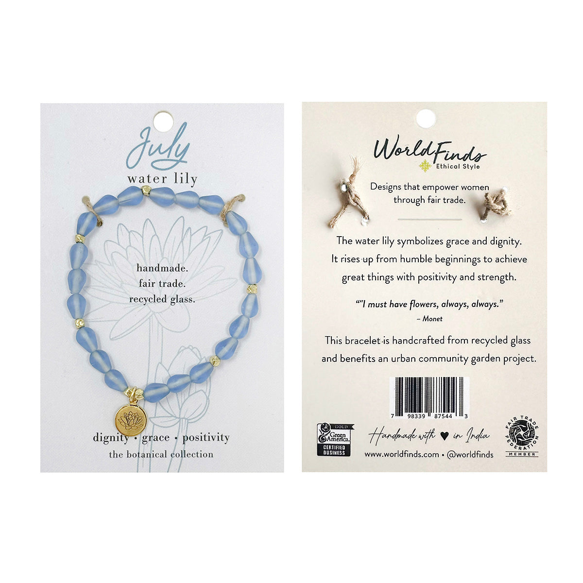 Hello, July! 🩵 Part of our Botanical Collection, the July Bracelet is crafted from rich blue glass beads, brass accent beads, and features a water lily charm. Great for gifting, the card features the water lily and it's symbols of dignity, grace and positivity, along with a garden-inspired quote. This bracelet also benefits an urban community garden project!
