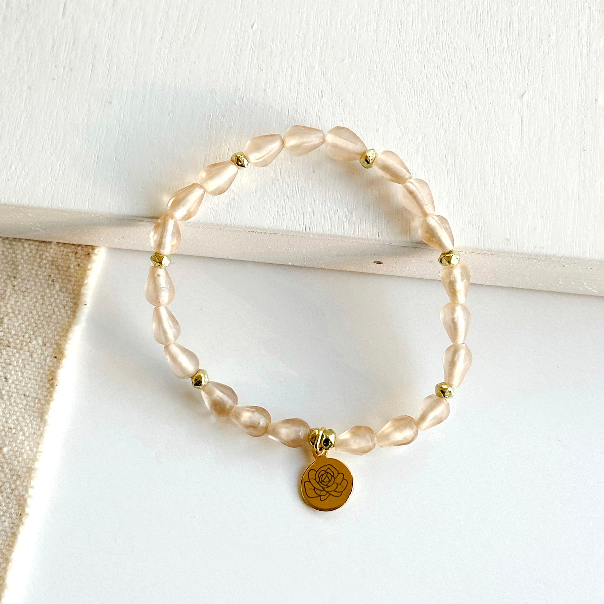 Hello, June! 🌹 Part of our Botanical Collection, the June Bracelet is crafted from soft pink glass beads, brass accent beads, and features a rose charm. Great for gifting, the card features the rose and it's symbols of passion, beauty & honor, along with a garden-inspired quote. This bracelet also benefits an urban community garden project!