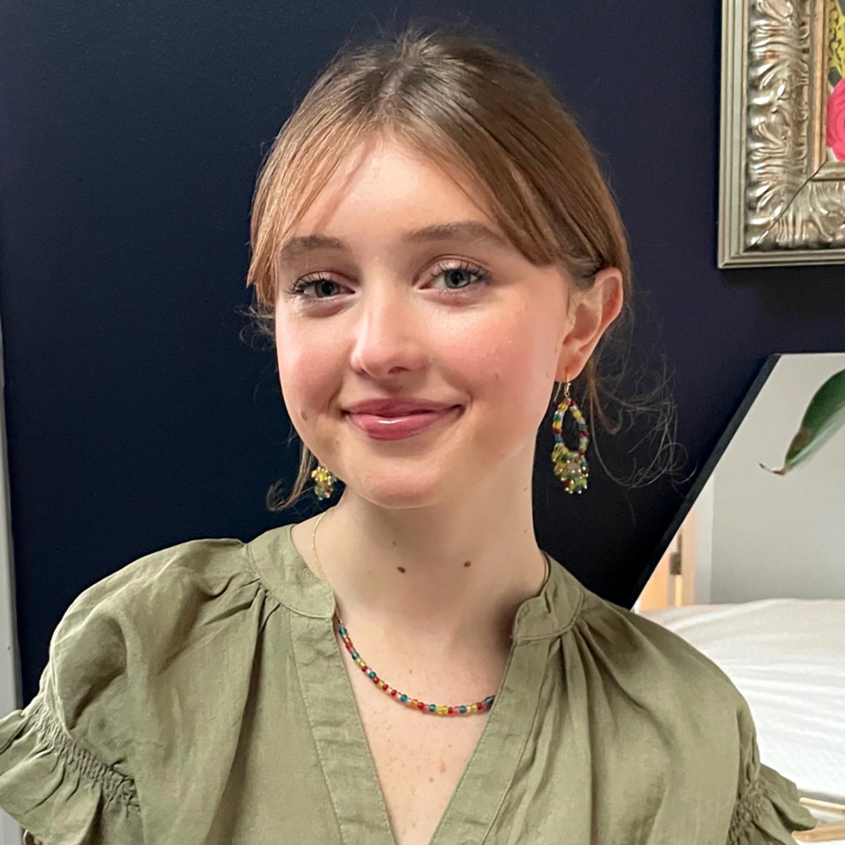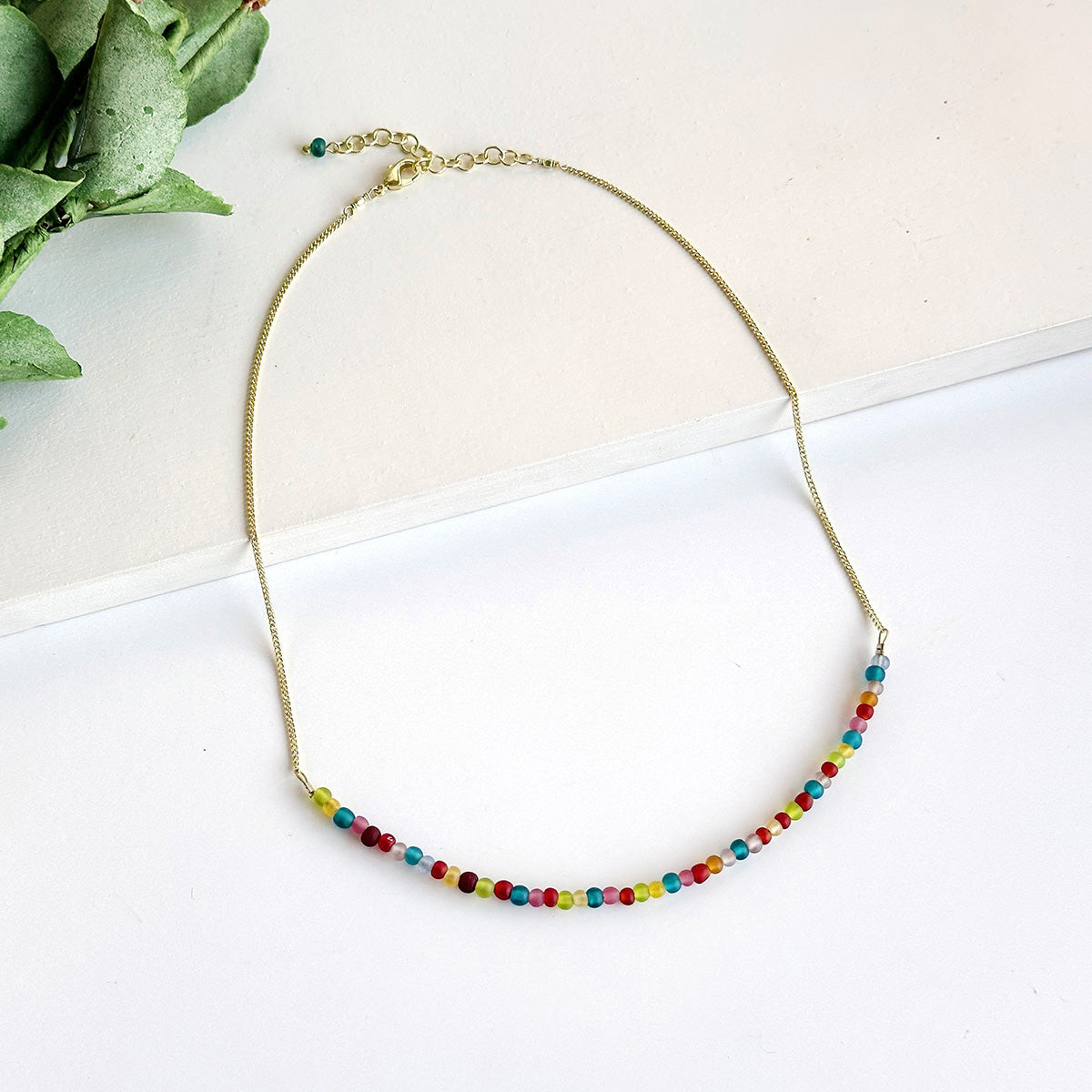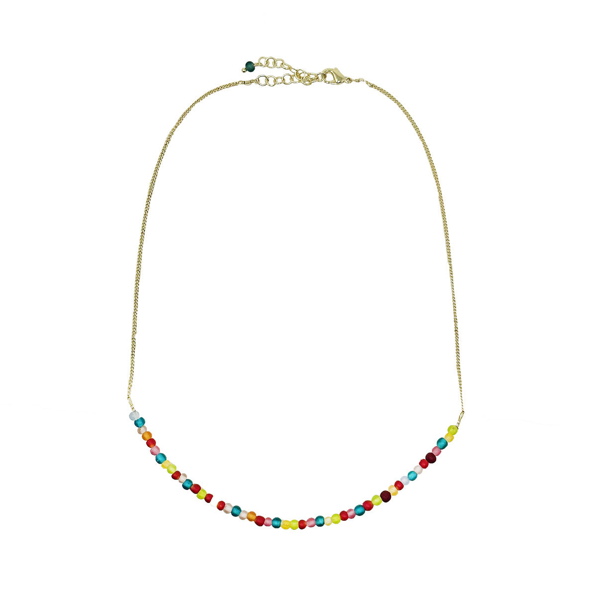 A delicate strand of multicolor glass beads is centered on a gold metallic chain, and adds the perfect, versatile adornment to any ensemble. The semi-opaque beads have a satin, frosted texture and are handmade from recycled glass. Looks great worn singly or layered, and styles beautifully with metallic, glass bead and Kantha jewelry.