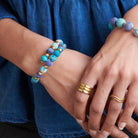 Colorful round Kantha beads in shades of blue and a trio of brass paillette discs are strung on memory wire to form a fabulous wrap bangle. The memory wire makes this bangle-style super easy to get on and off.