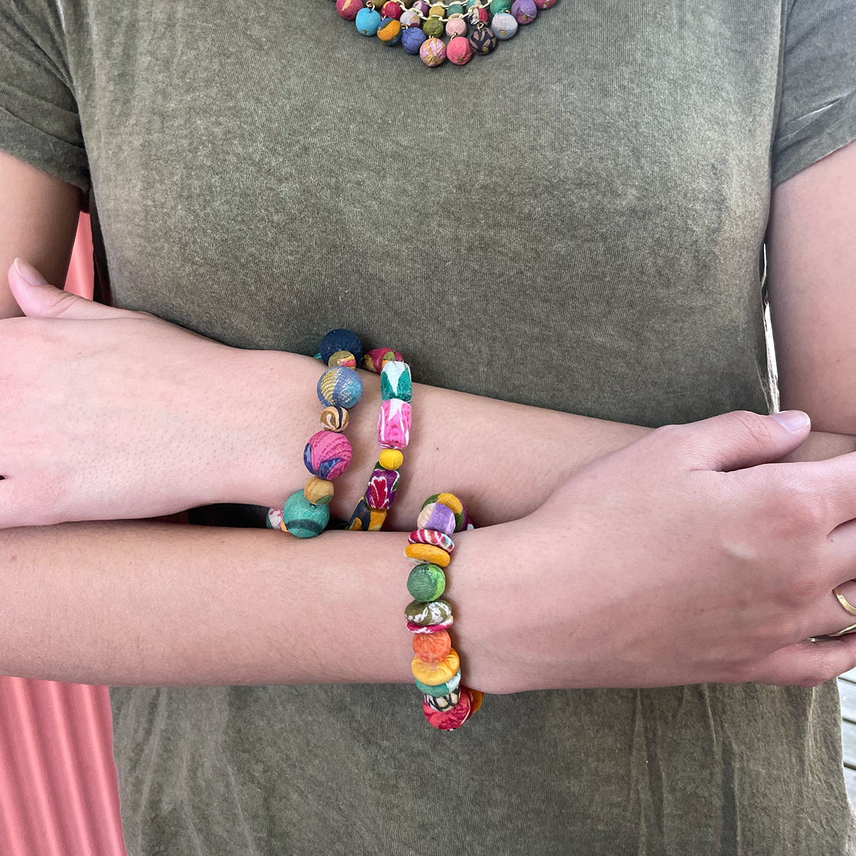 Disc-shaped Kantha 'button' beads are paired and alternate with traditional round Kantha beads for a colorful grouping of shapes and textures.
