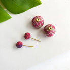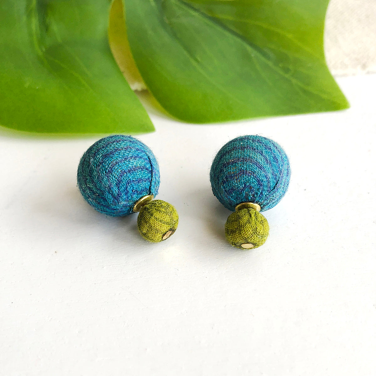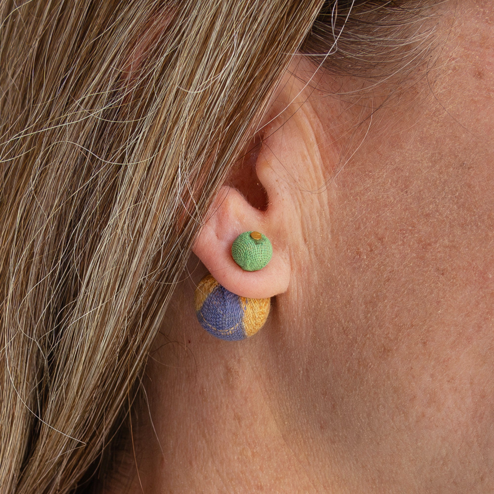 A modern take on the classic post, the Kantha Double Ball Posts add a fun pop of color to your look. Wear this versatile style with the large bead in front or in the back for a fresh, layered silhouette. Handmade from repurposed Kantha textiles, colors and patterns will vary. Finished with nickel and lead-free post wires.