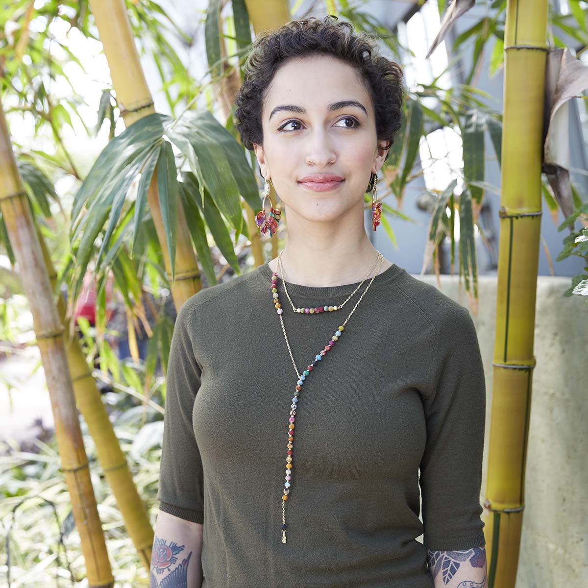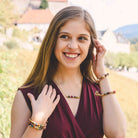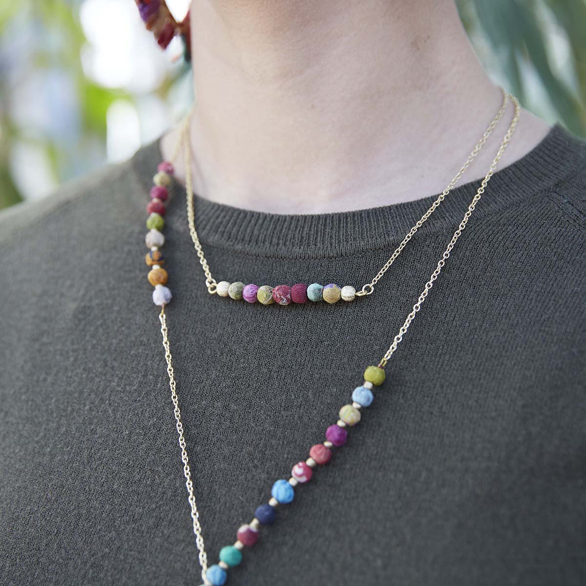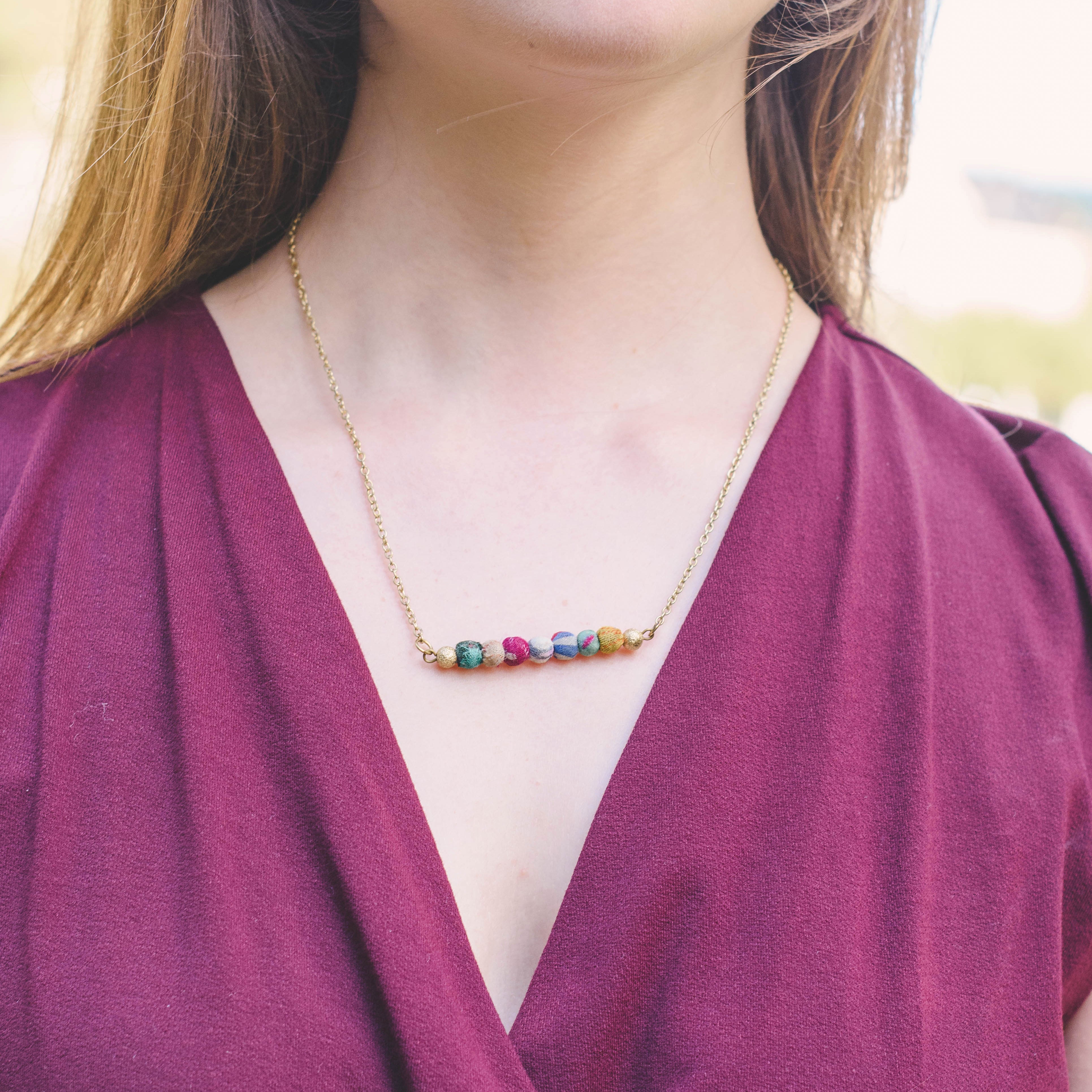 This simple, wear-with-everything necklace will quickly become your new favorite piece. Seven colorful Kantha textile beads form a small bar, bookended with gold metallic beads. Perfect worn alone or layered with other styles.