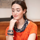 Vibrant beads of indigo, black and white create this unique and striking statement bracelet. Crafted from upcycled Kantha textile, each piece is unique and colors vary slightly.
