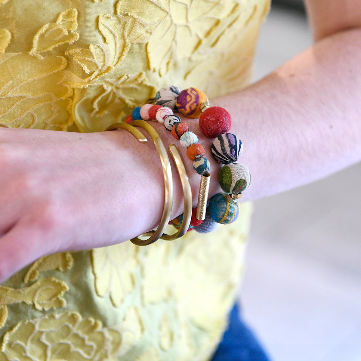 A gleaming gold cylinder brings a touch of sparkle to a vibrant Kantha textile bracelet. Perfect to wear on its own or stack with other Kantha and metallic pieces. Handmade from repurposed sari and Kantha cotton textiles; colors and patterns will vary.