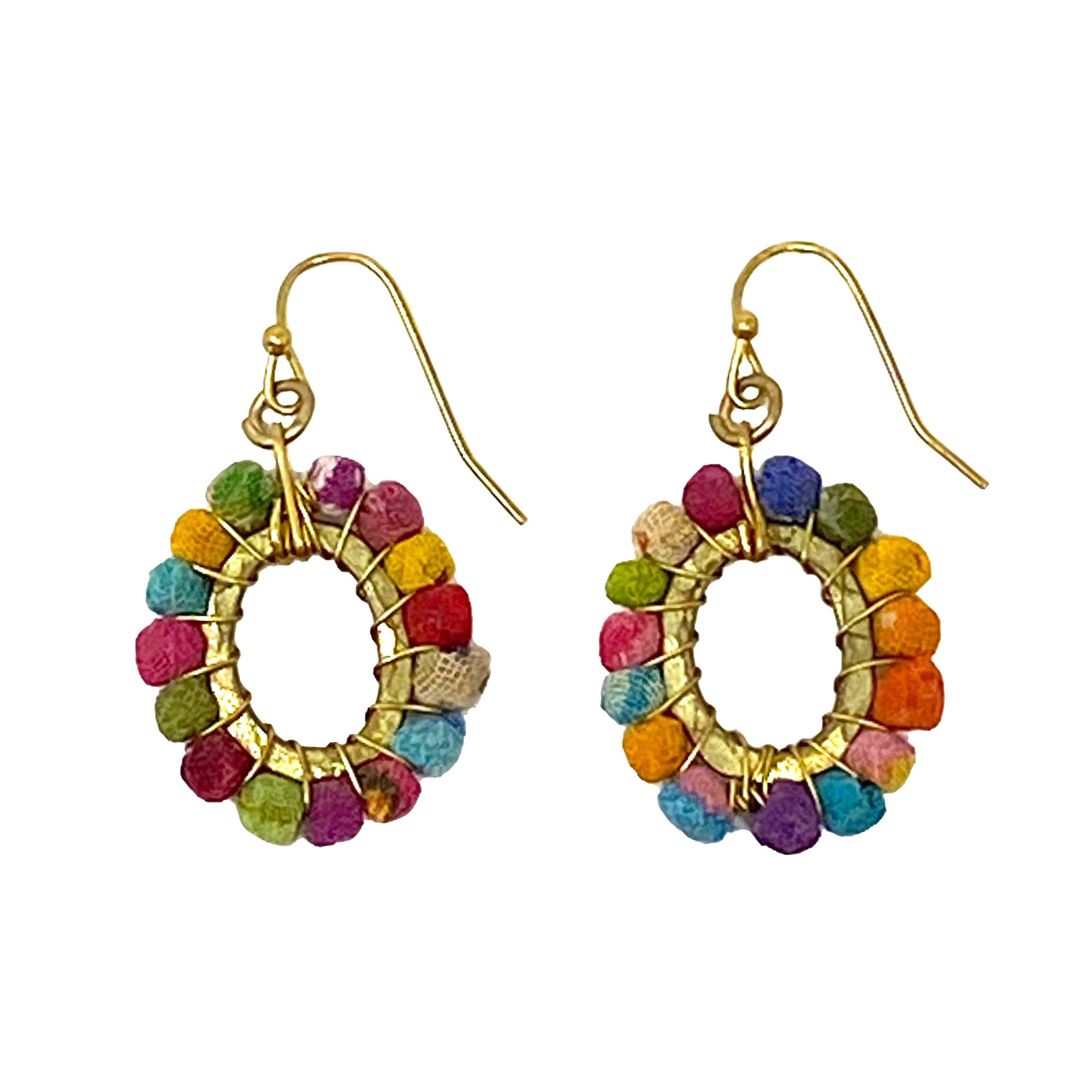 Teeny tiny Kantha beads are hand-wrapped around an oval-shaped brass metal base. A lovely mix of color, texture, and shimmer, this delicate style packs a colorful punch. Crafted from reclaimed Sari and Kantha fabric, each is one-of-a-kind and exact colors will vary.