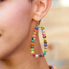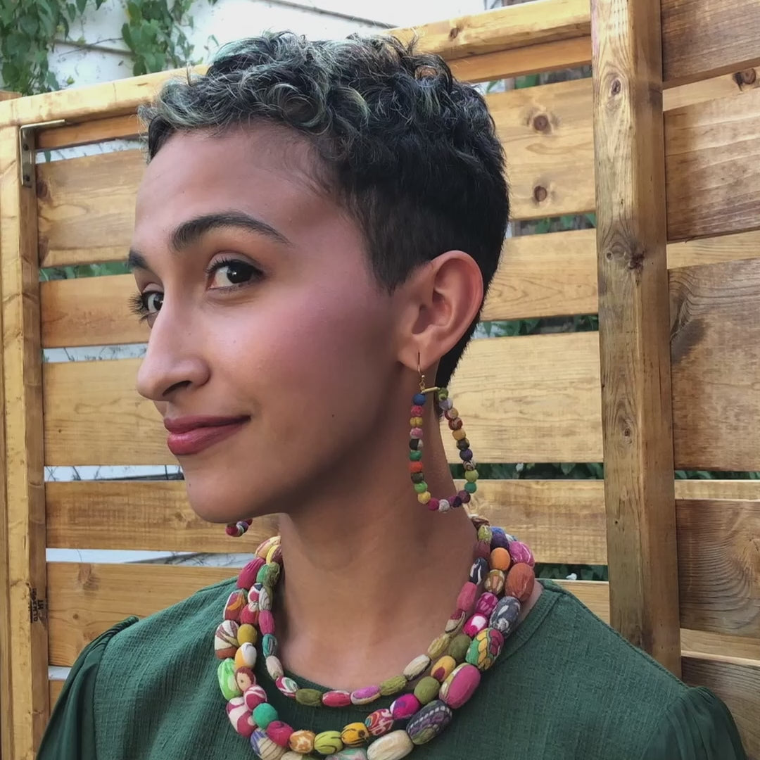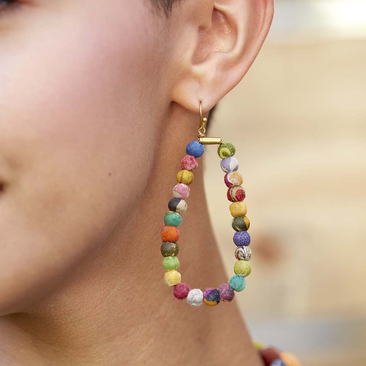 Likely to become your new favorites, these Oblong Hoops are lightweight yet statement-making. Colorful, repurposed Kantha textile beads loop around and meet at a brass metal cylinder. Extra fabulous on Zoom calls too! Each pair is one-of-a-kind as they're made from upcycled fabric. Finished with nickel-free/lead-free earring wires.