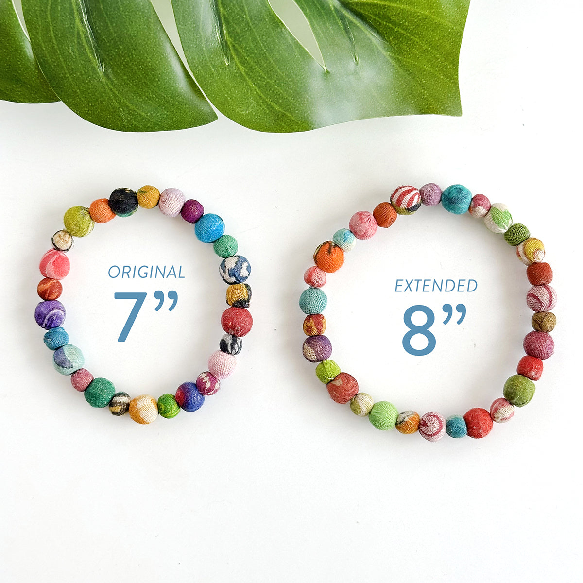 Now available in an extended size for a more comfortable fit, the Kantha Poetic Bracelet features subtly alternating-sized Kantha beads for a classic silhouette. Embrace the one-of-a-kind pattern and colors - no two bracelets are the same!
