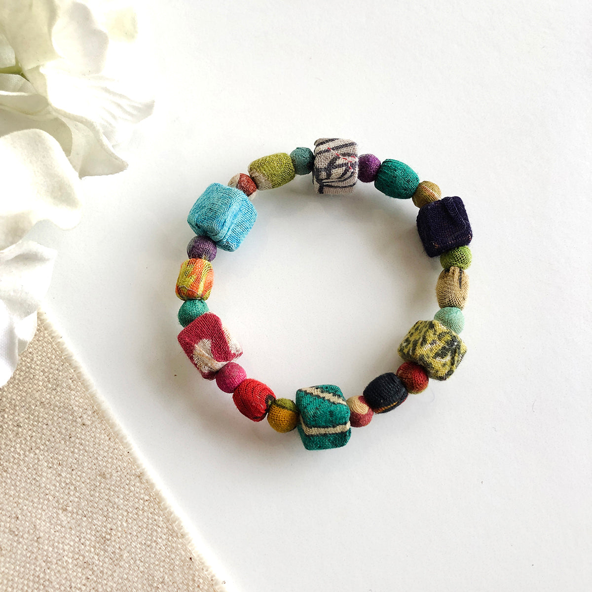 Vibrant beads in round, oval and square shapes join forces to form this cheerful, stretchy bracelet. Fabric from upcycled Kantha fabrics wraps the recycled wood base to form each bead so colors will vary.