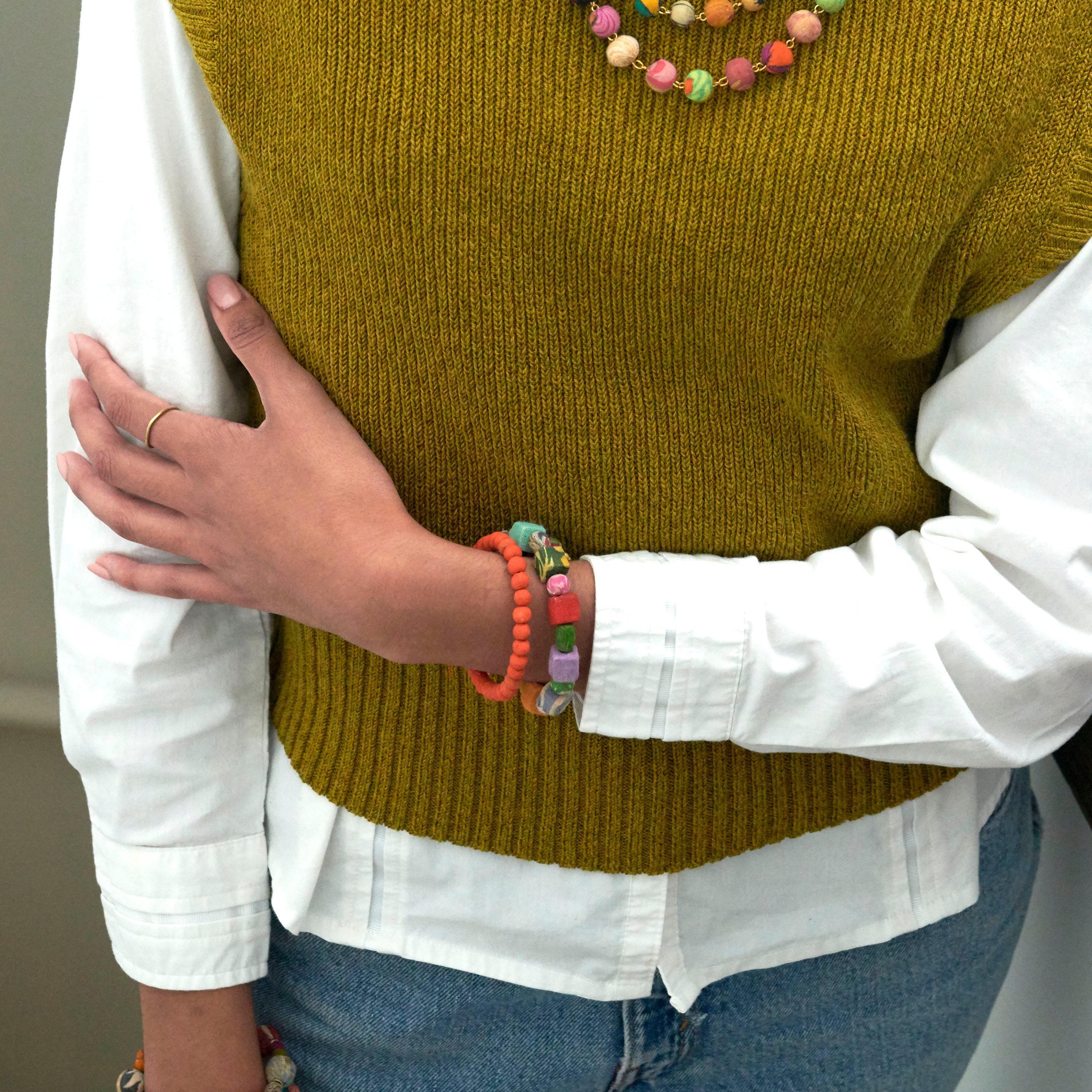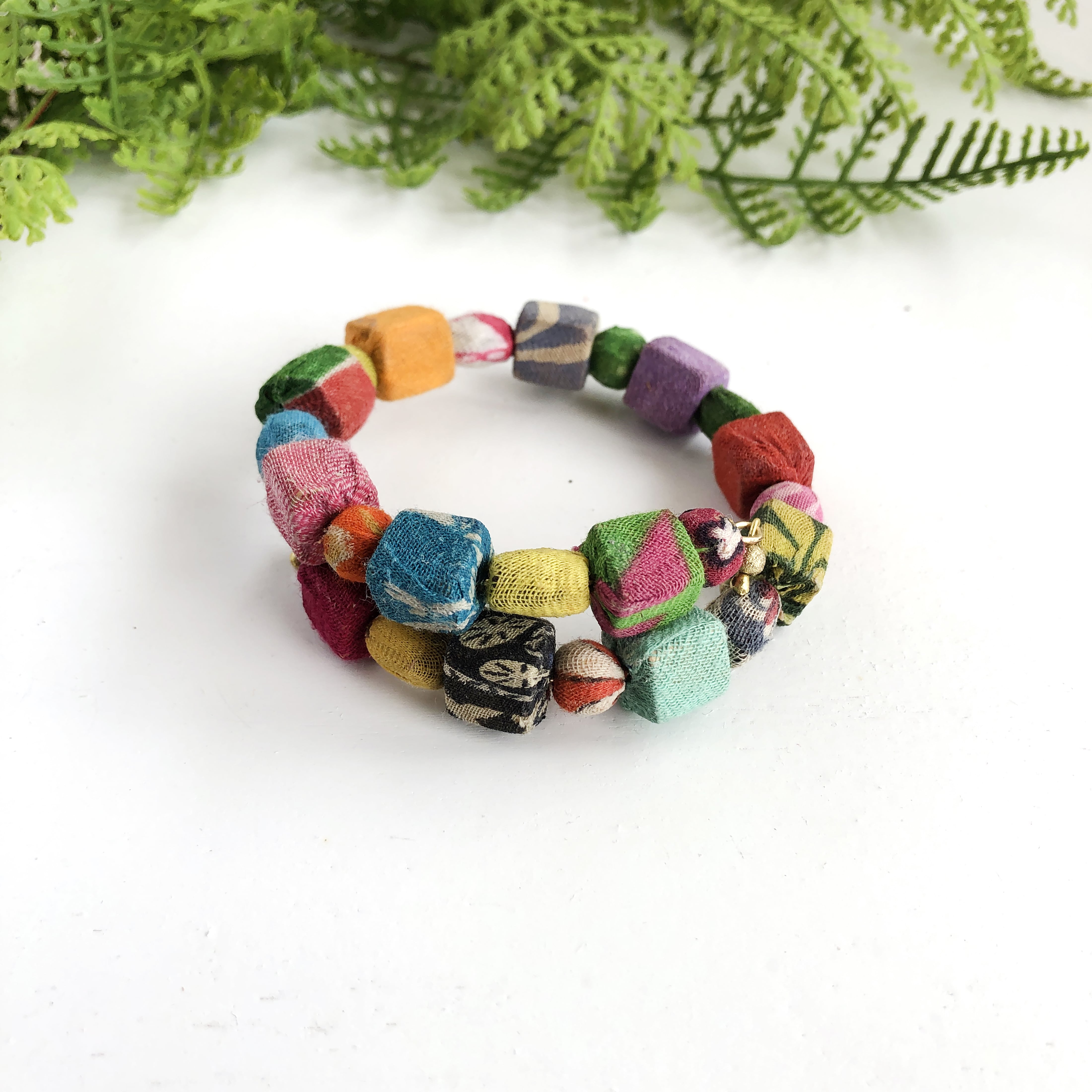 A unique combination of Kantha beads in playful square, round and oblong shapes are strung on memory wire to create this adjustable bangle. Each bracelet is made from upcycled Kantha textiles covering a wood base, so colors and patterns are unique and will vary.