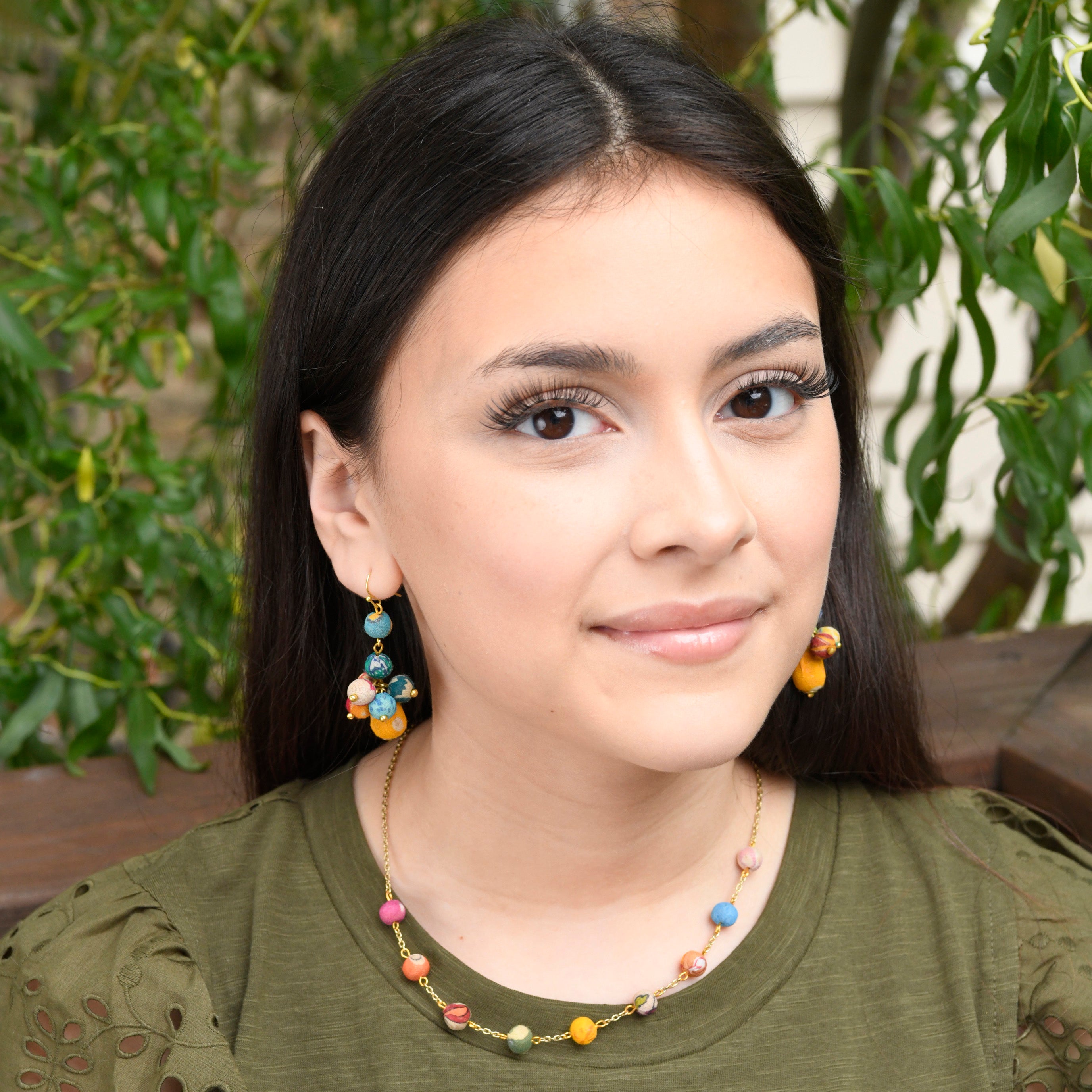 Packed with personality, these dimensional drop earrings are handmade from a tiered arrangement of Kantha beads. Each is made from repurposed fabric covering a wood base, so colors and patterns will vary.