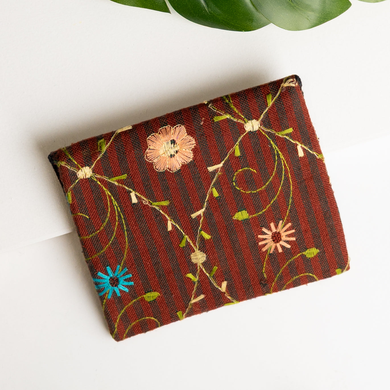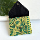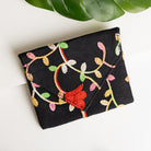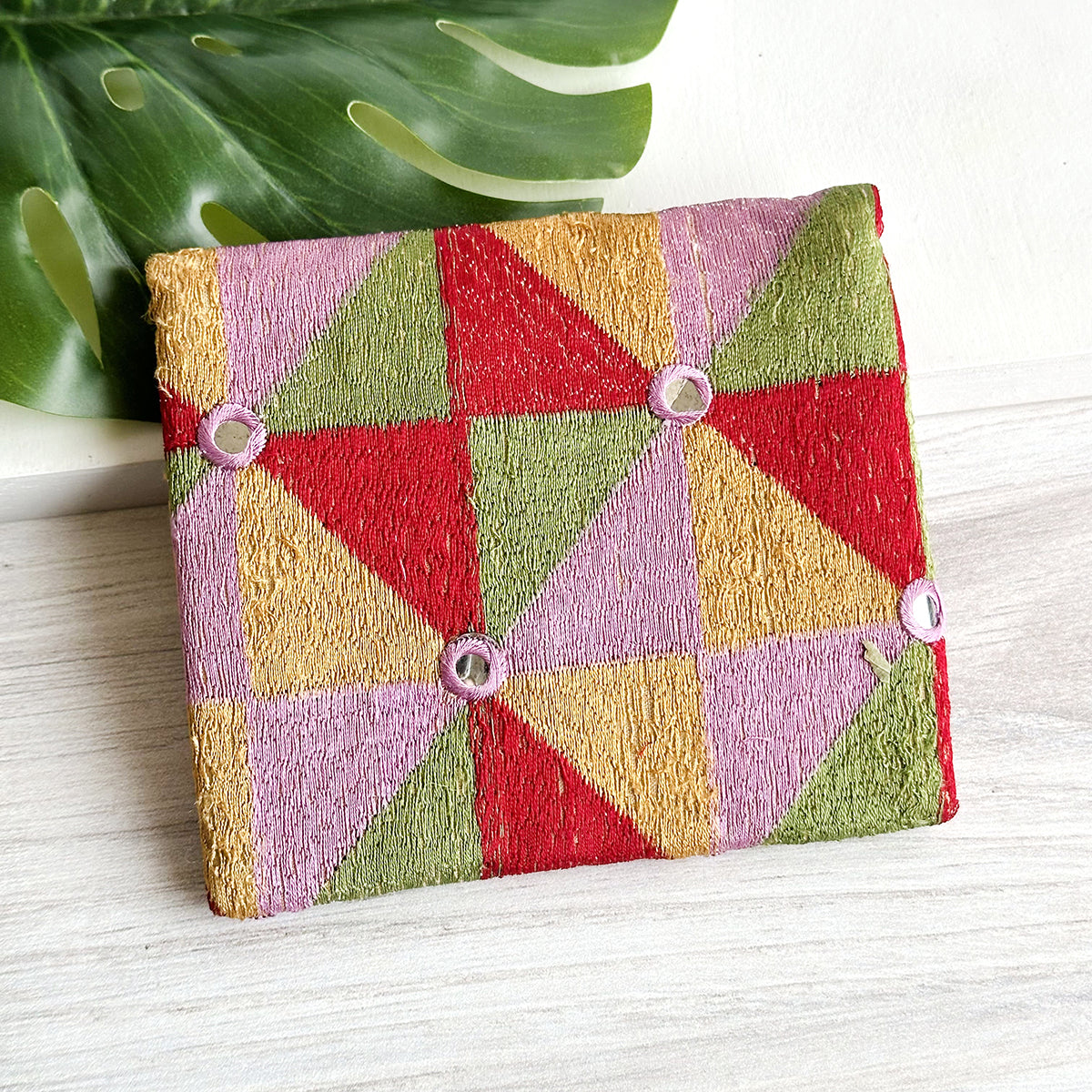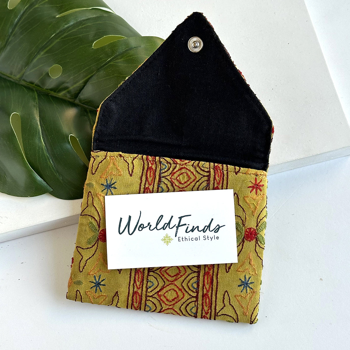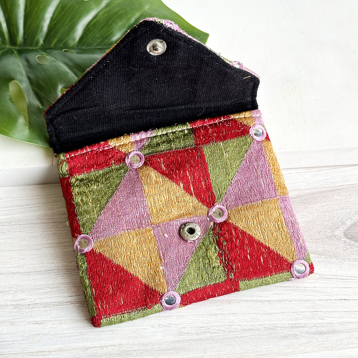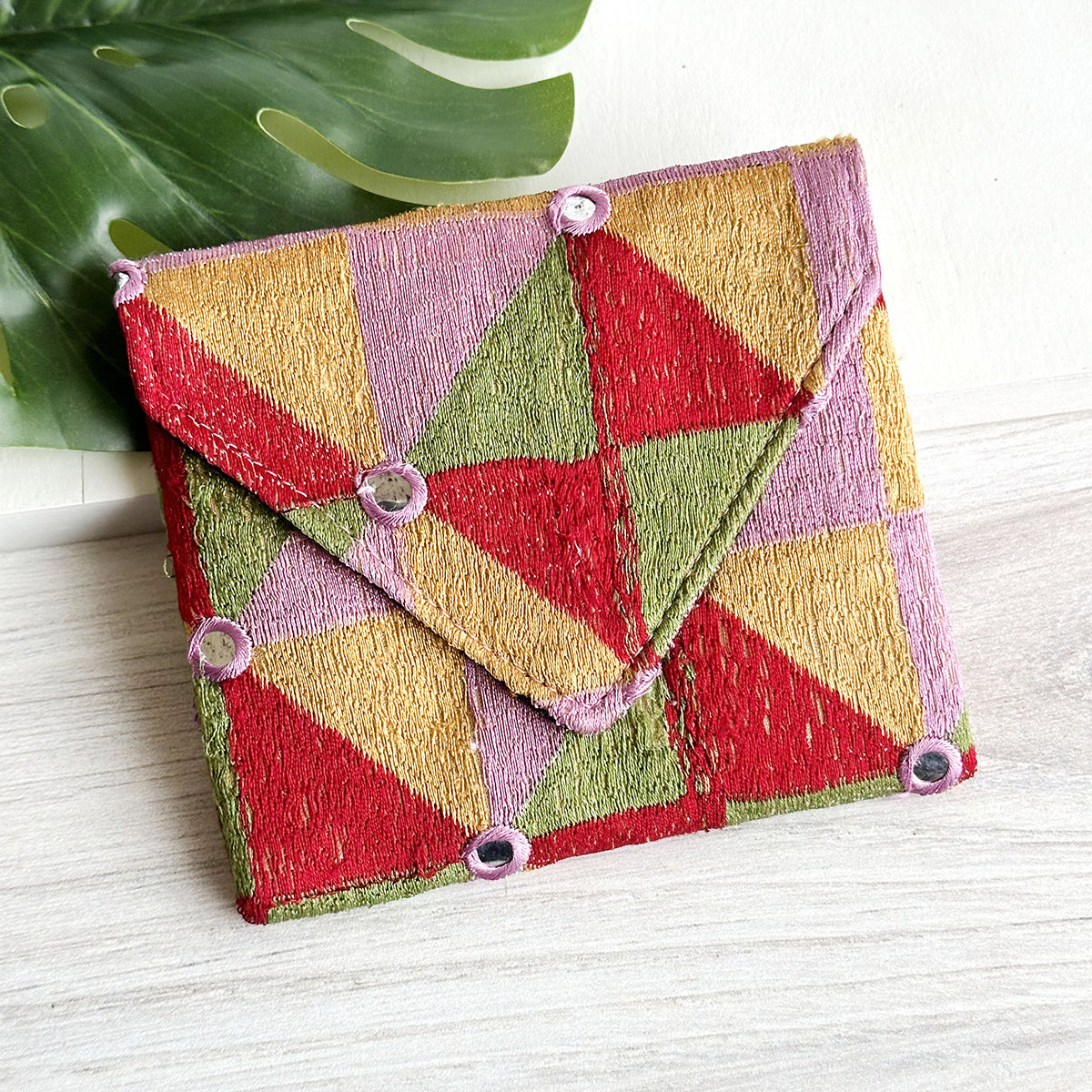 This eco-friendly mini pouch is handcrafted from upcycled Kutch textiles. Kutch is a traditional textile in India known for its vibrant colors, needlework, mirrorwork, tactile embroidery, and captivating motifs. Each pouch is finished with a snap closure.