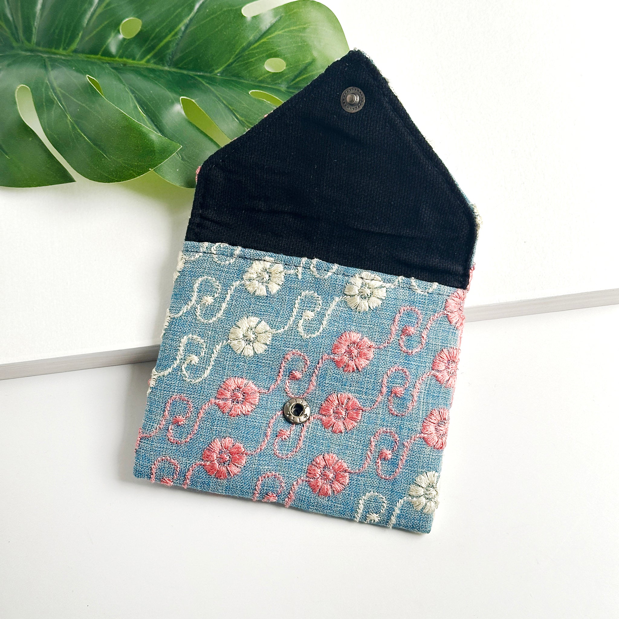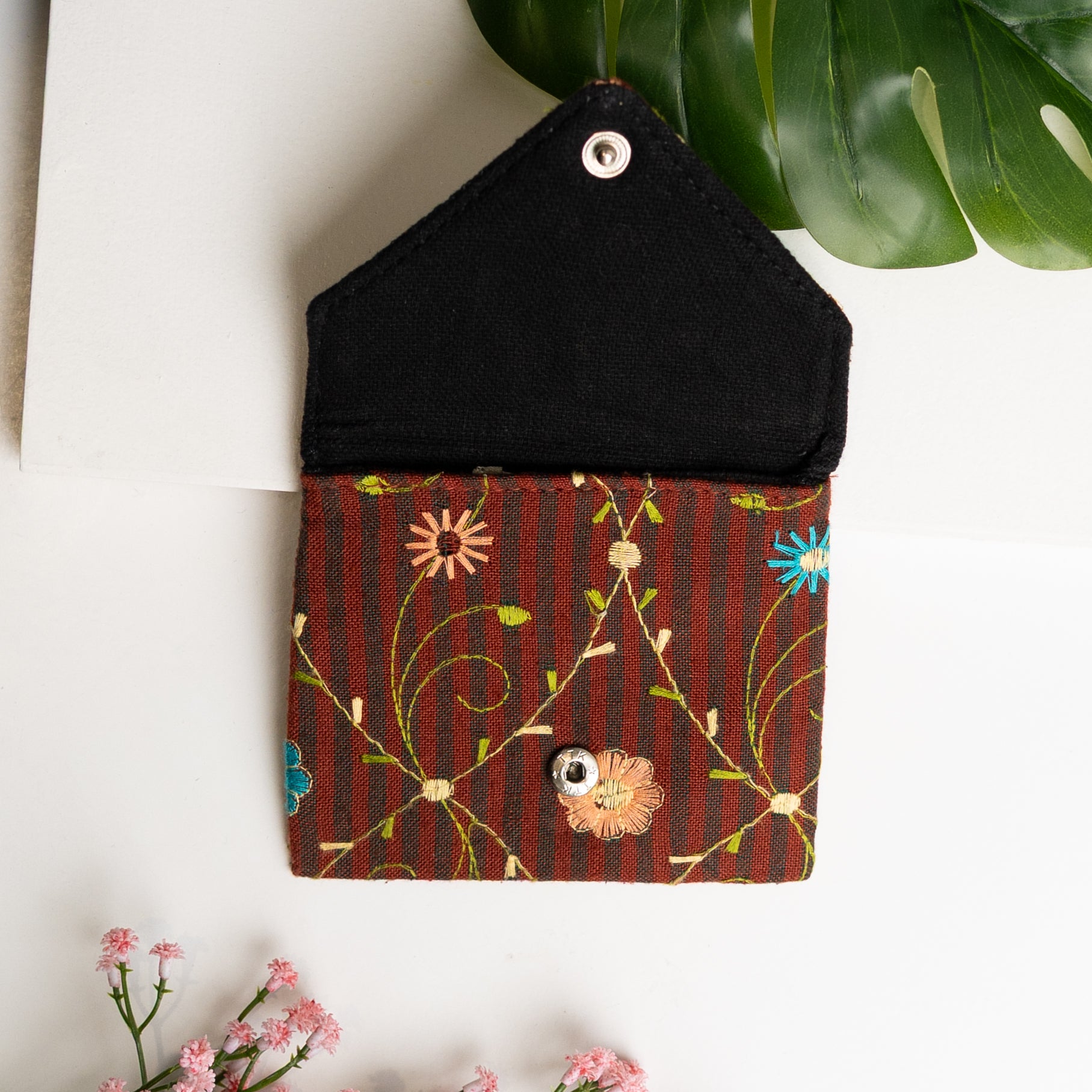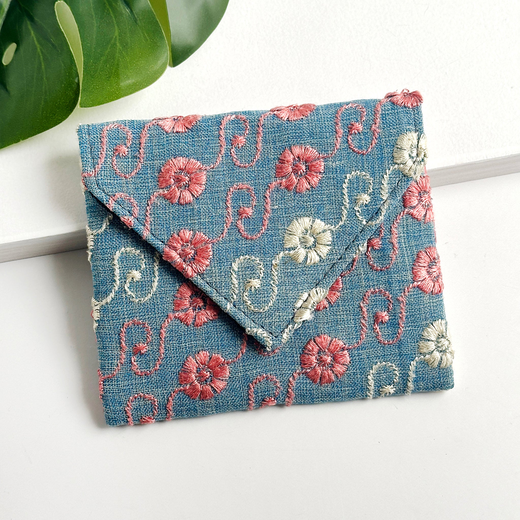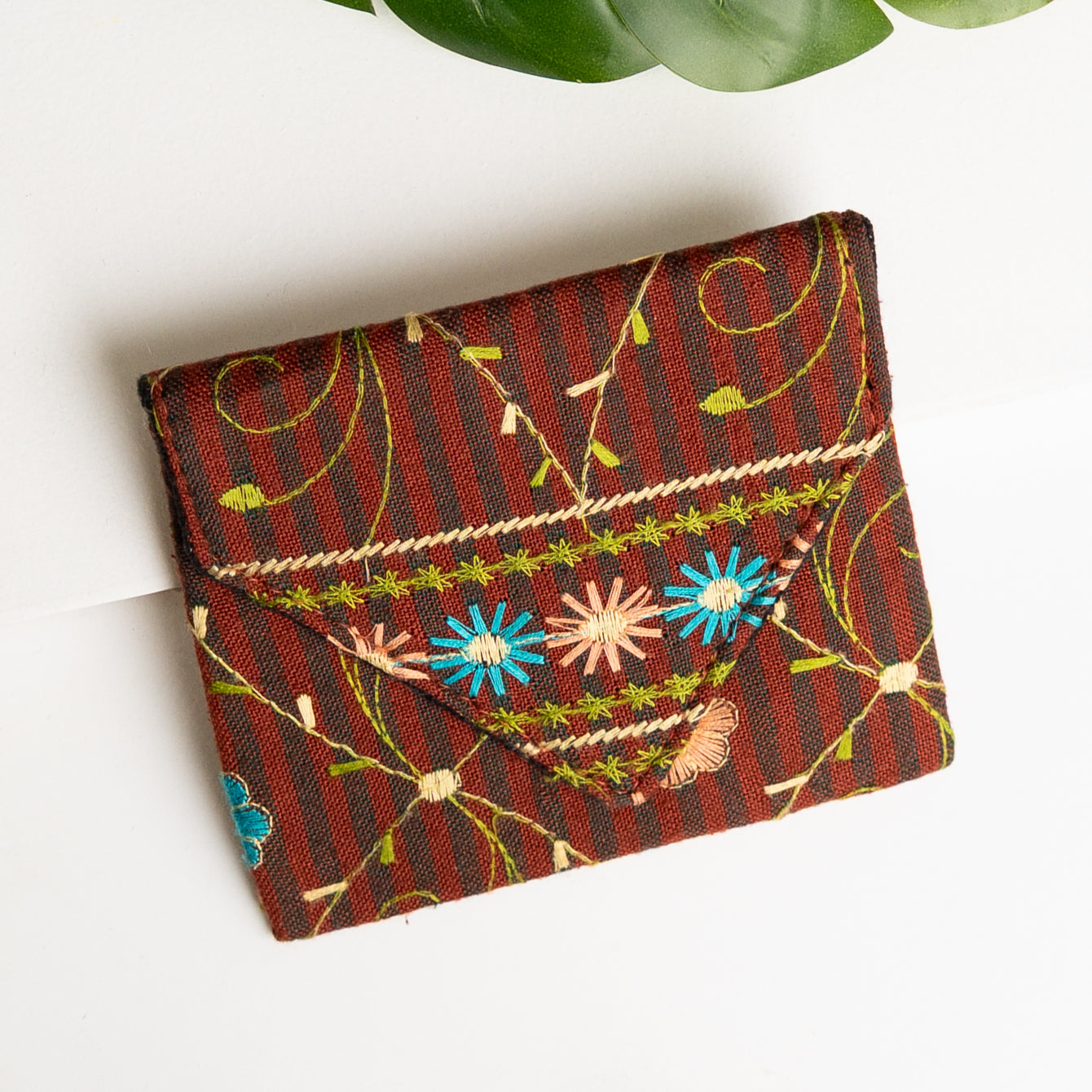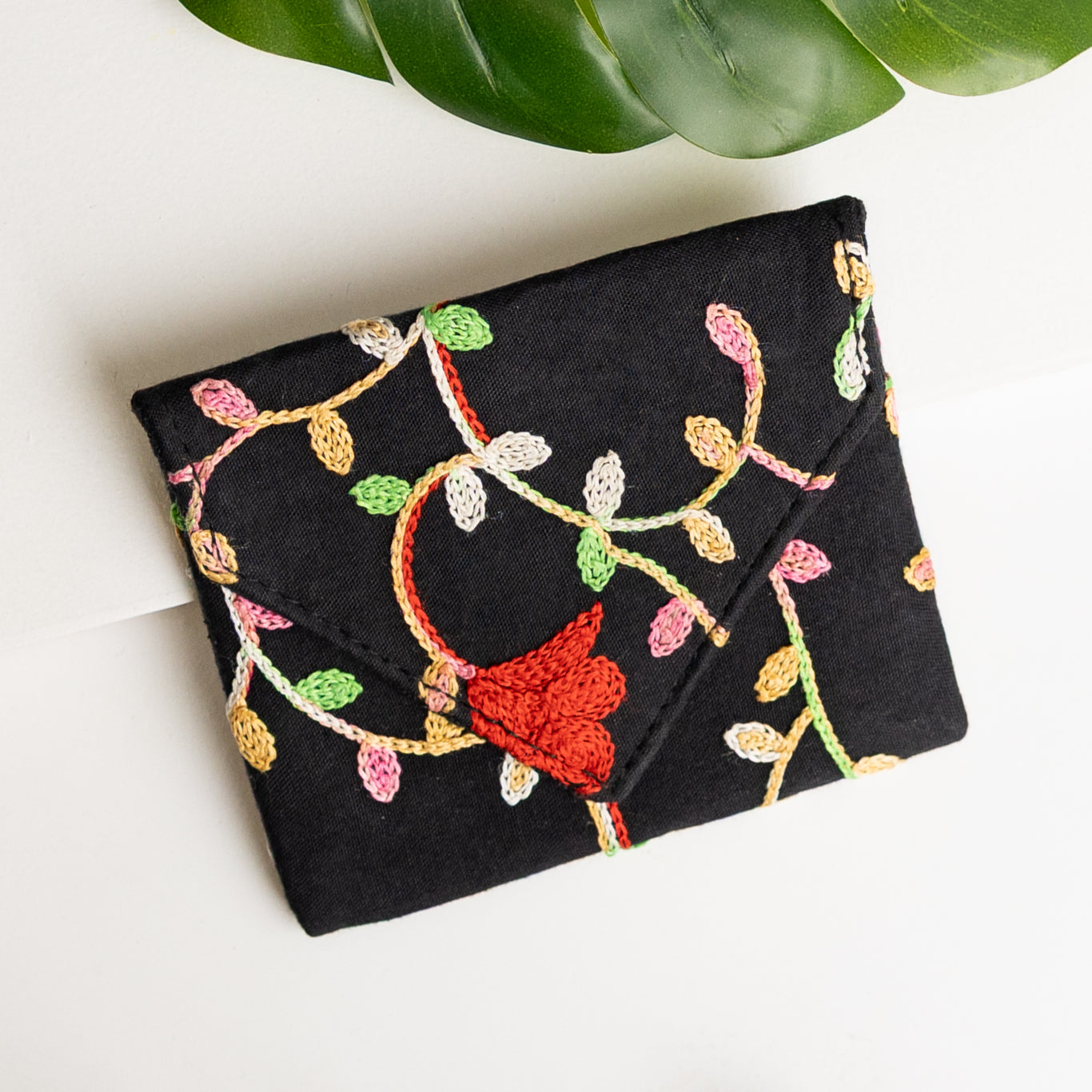 This eco-friendly mini pouch is handcrafted from upcycled Kutch textiles. Kutch is a traditional textile in India known for its vibrant colors, needlework, mirrorwork, tactile embroidery, and captivating motifs. Each pouch is finished with a snap closure.