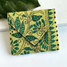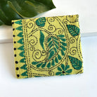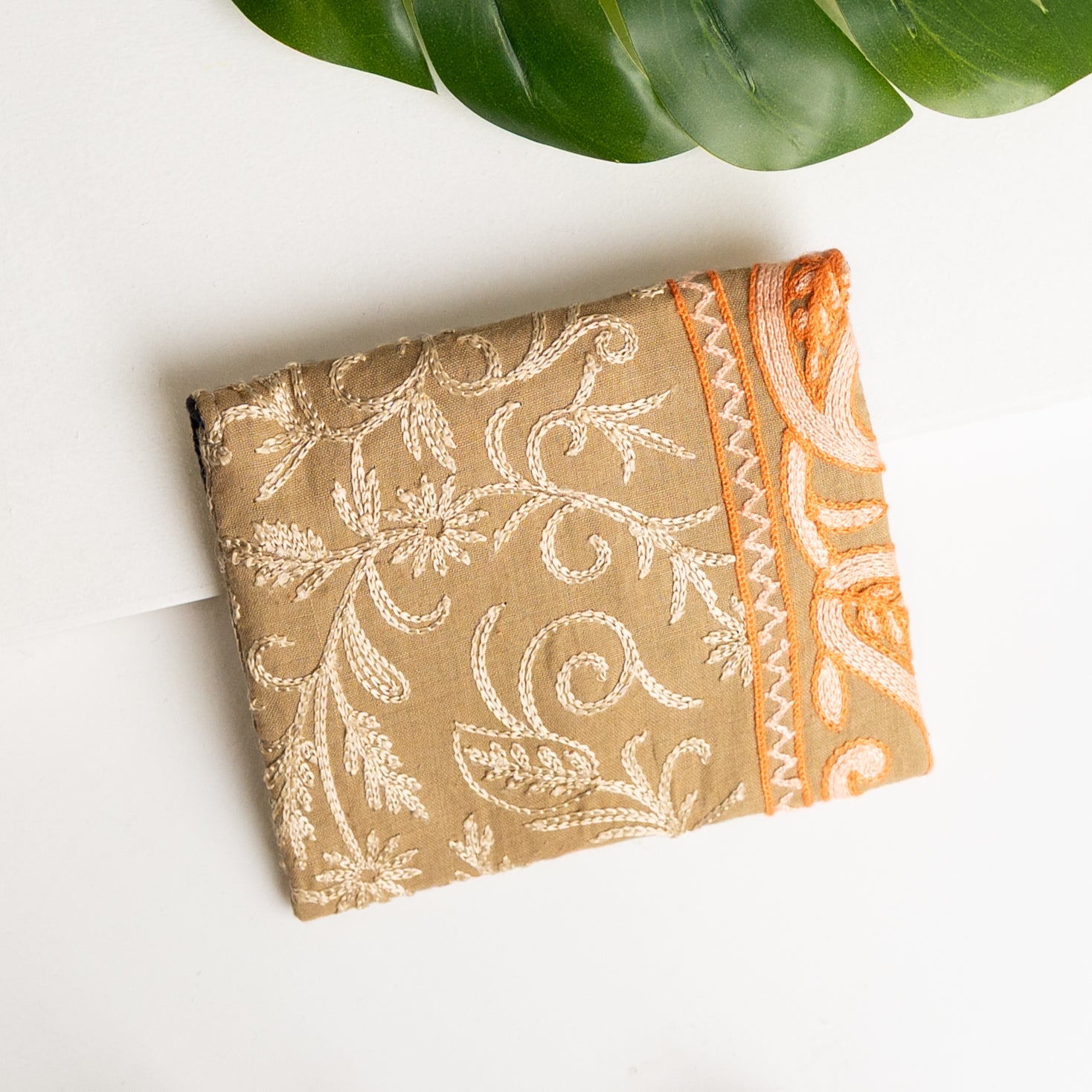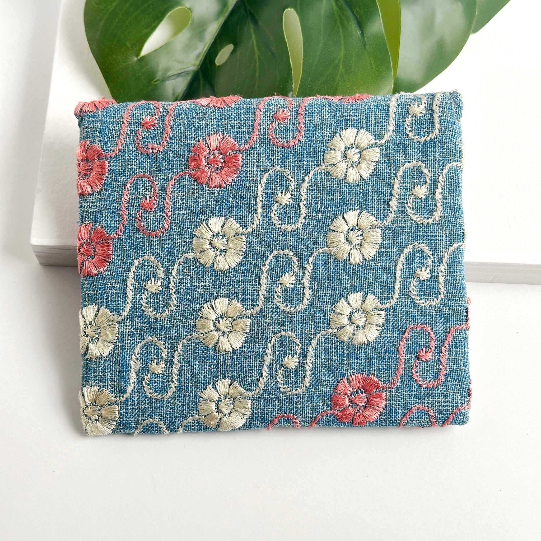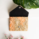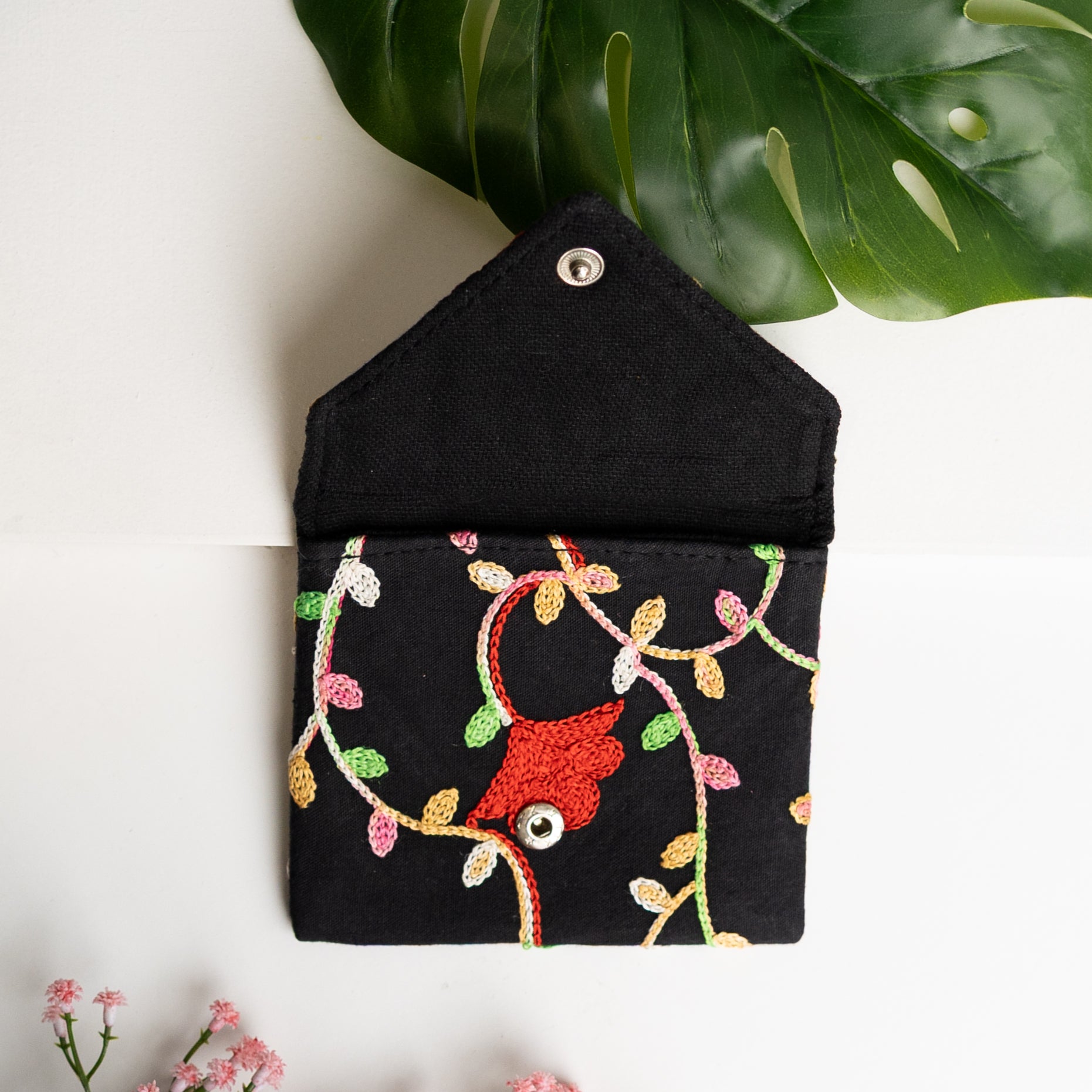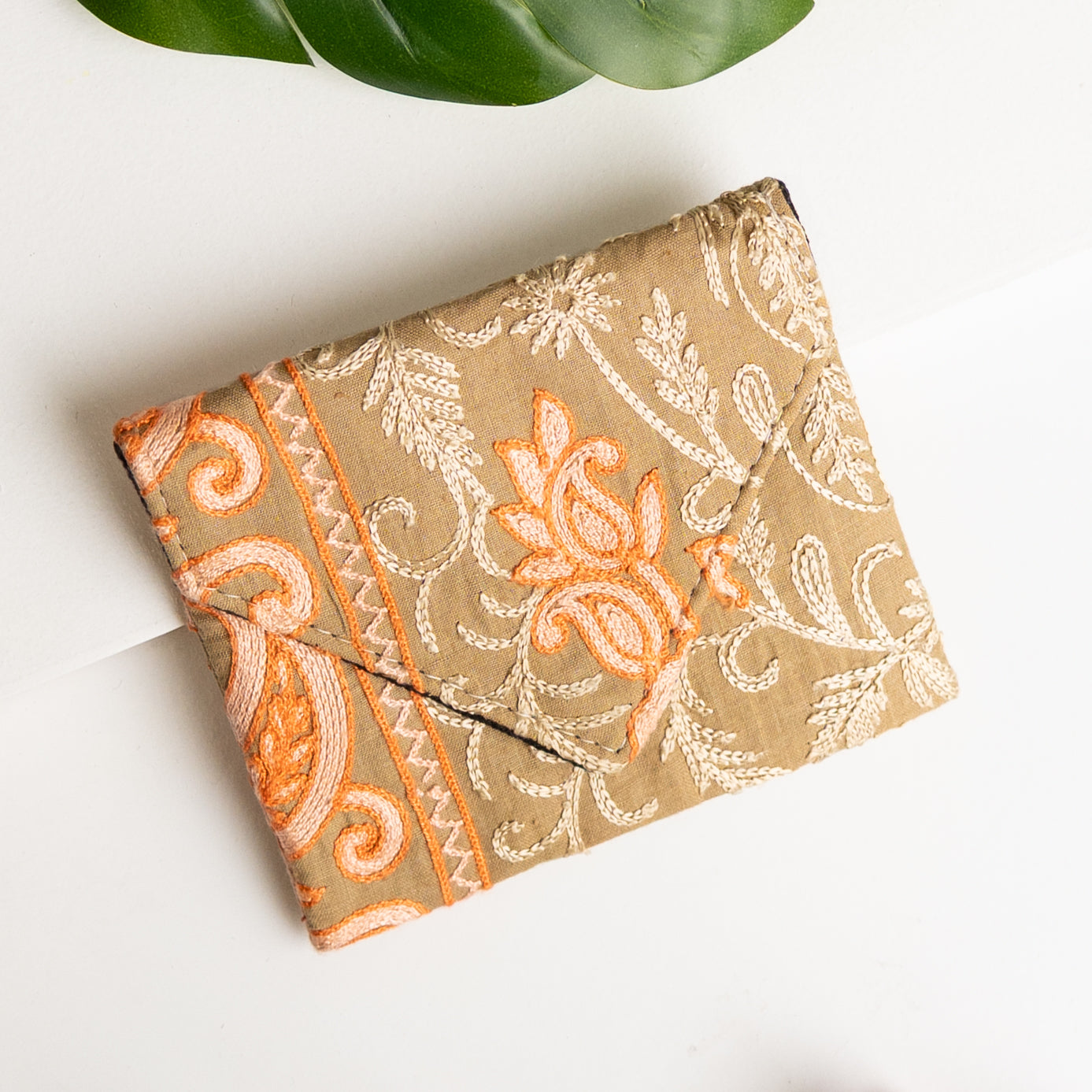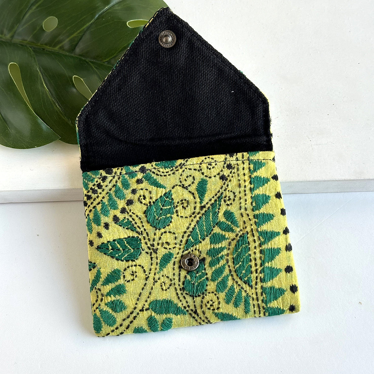 This eco-friendly mini pouch is handcrafted from upcycled Kutch textiles. Kutch is a traditional textile in India known for its vibrant colors, needlework, mirrorwork, tactile embroidery, and captivating motifs. Each pouch is finished with a snap closure.