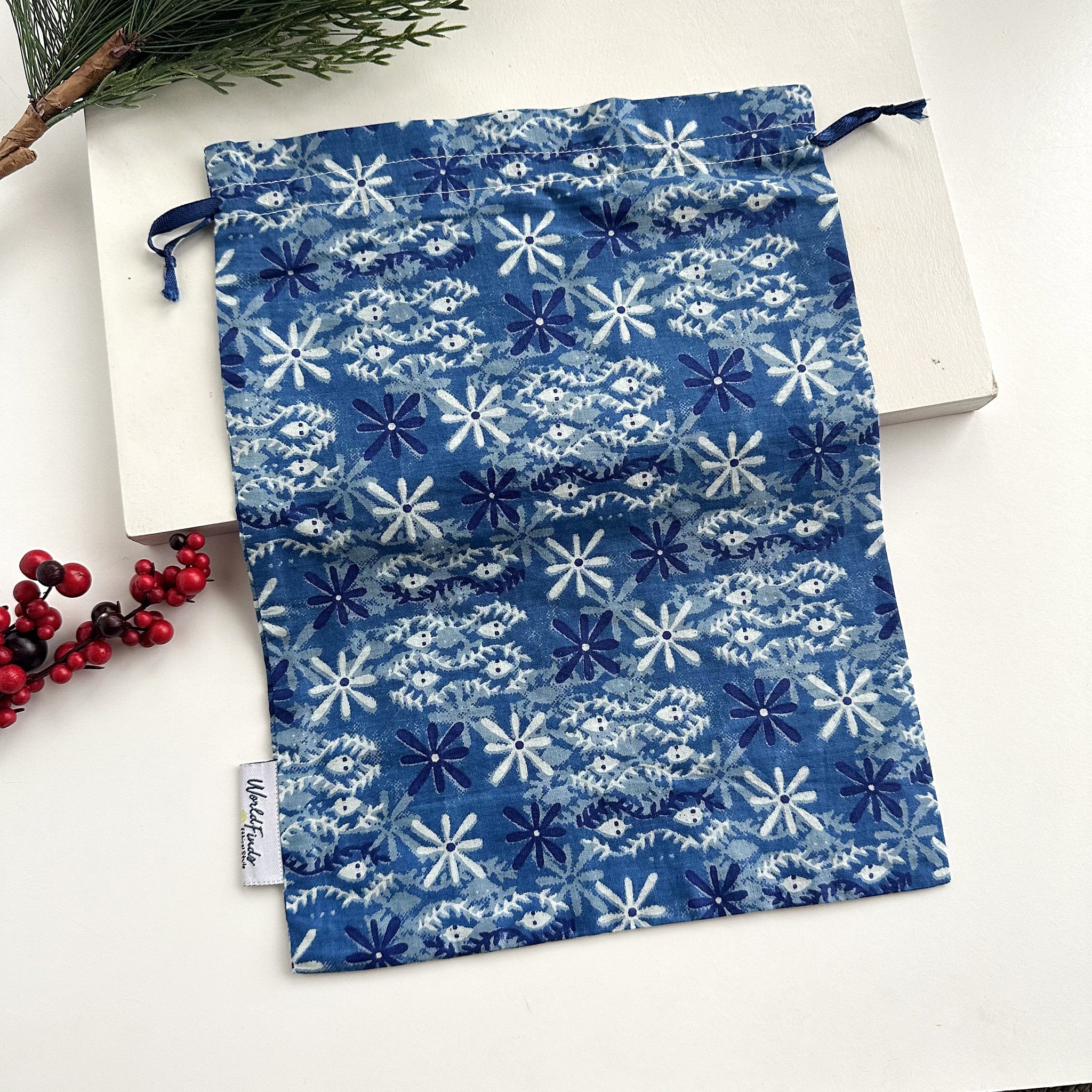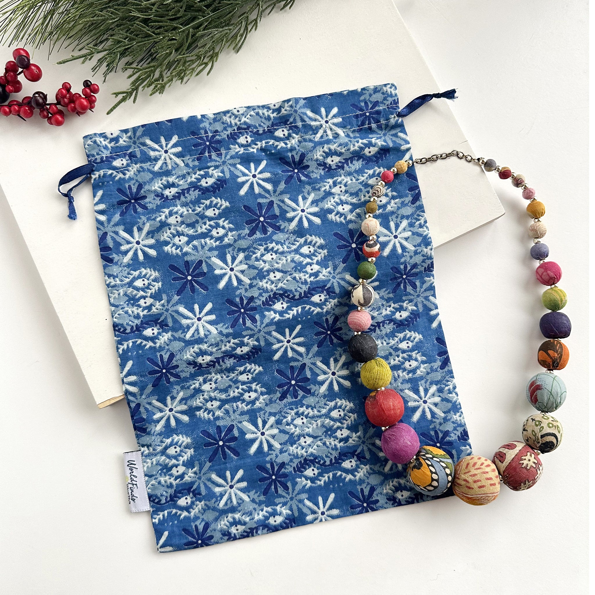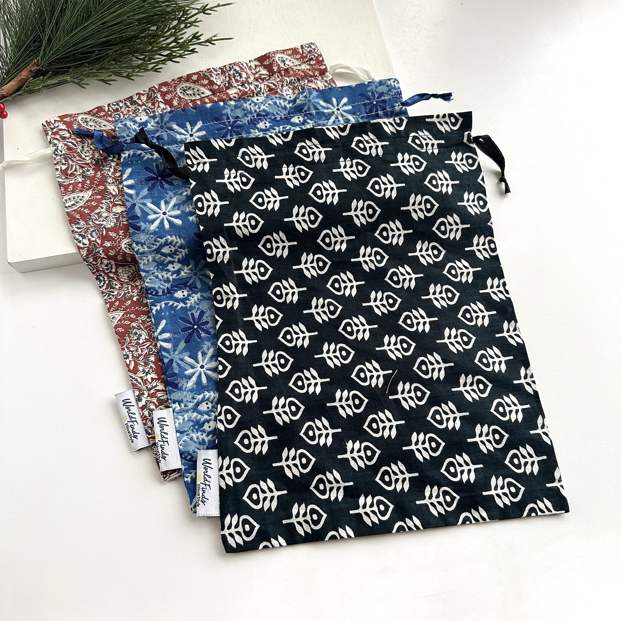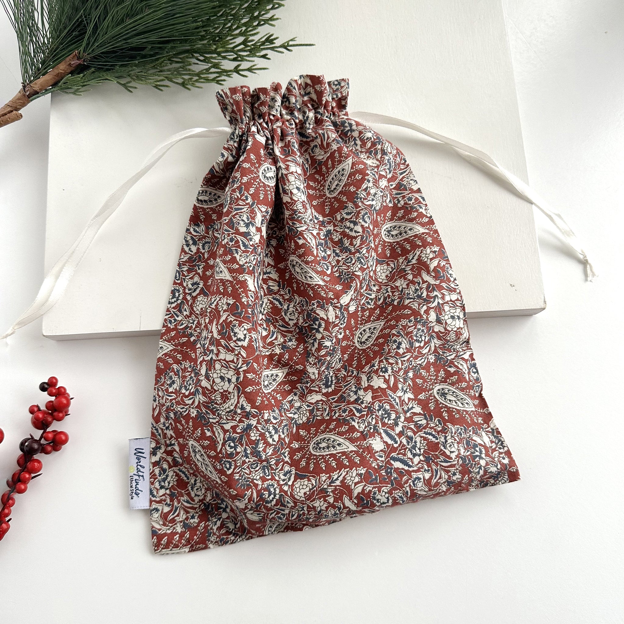 Wrap your gift in sustainable goodness! This large gift bag is great for large necklaces and most Sari Chic items. Each is made from upcycled Sari fabrics and each color/pattern is unique!
