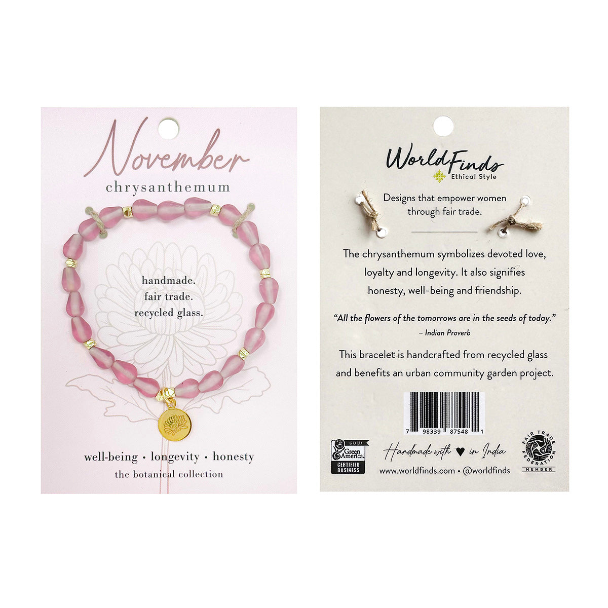 Hello, November! 🩷 Part of our Botanical Collection, the November Bracelet is crafted from soft pink glass beads, brass accent beads, and features a chrysanthemum charm. Great for gifting, the card features the chrysanthemum and it's symbols of well-being, longevity and honesty, along with a garden-inspired quote. This bracelet also benefits an urban community garden project!
