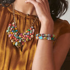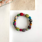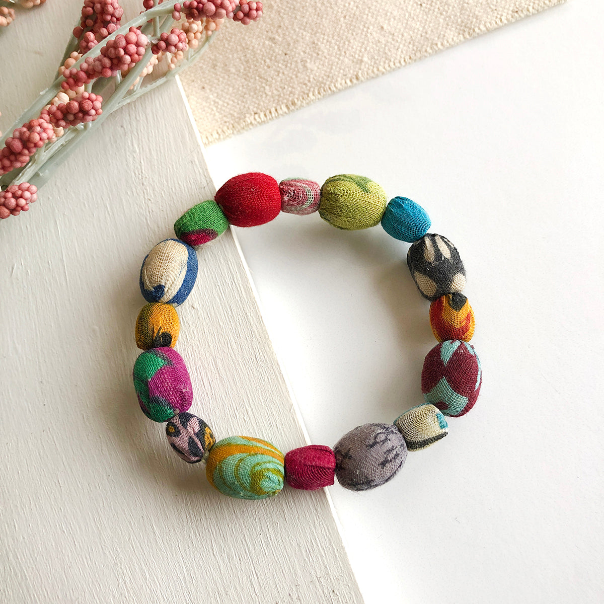 Small and large oval-shaped Kantha textile beads alternate to create this textured silhouette. Crafted from colorful, repurposed Kantha textiles that cover bead bases of salvaged wood. Each is one-of-a-kind.