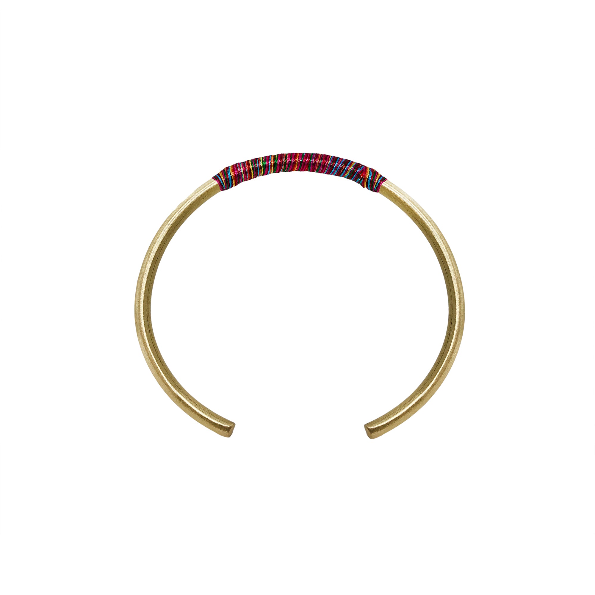 This elegant cuff is adorned with rainbow-hued threads, hand-wrapped around a gold brass cuff. A delightful addition to our Raja Rainbow line.