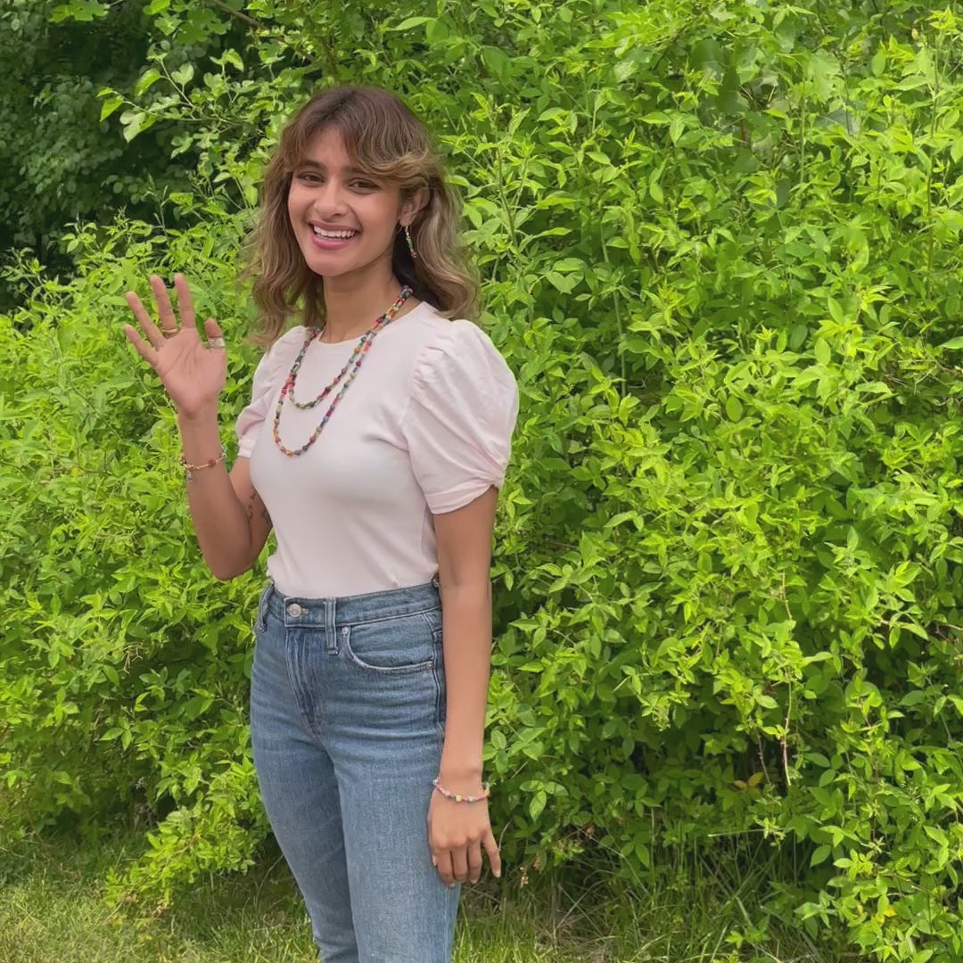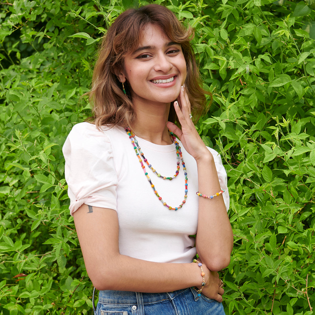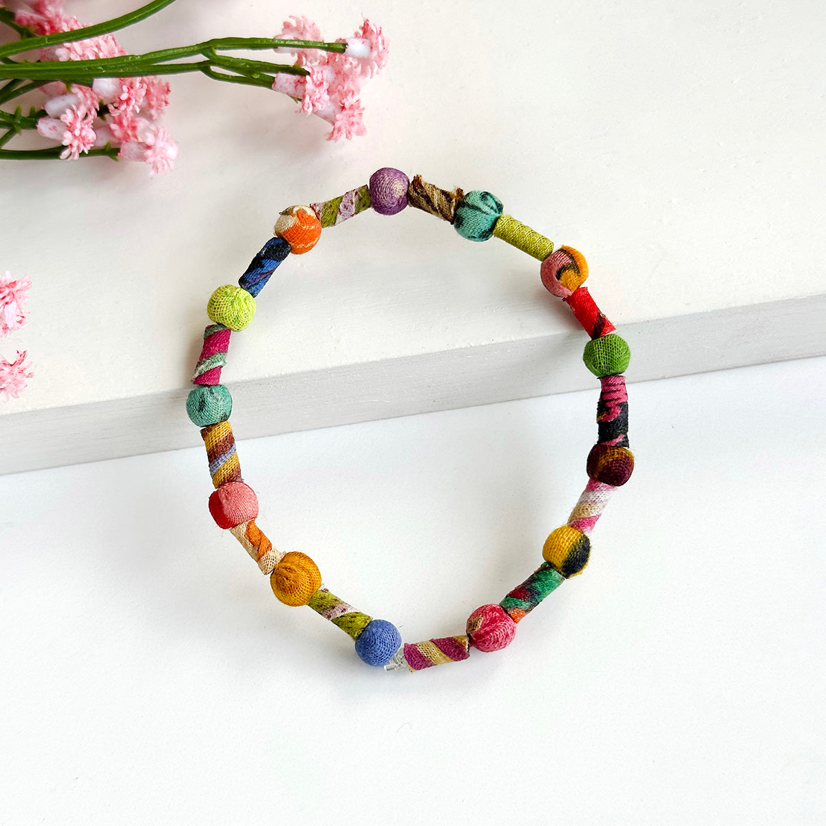 Crafted from repurposed Sari and Kantha fabric, the colorful beads are all one-of-a-kind.