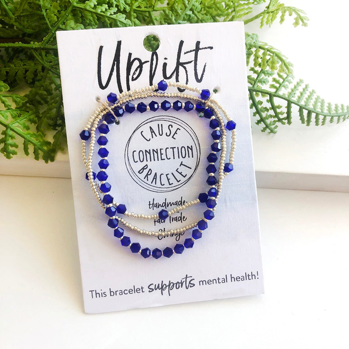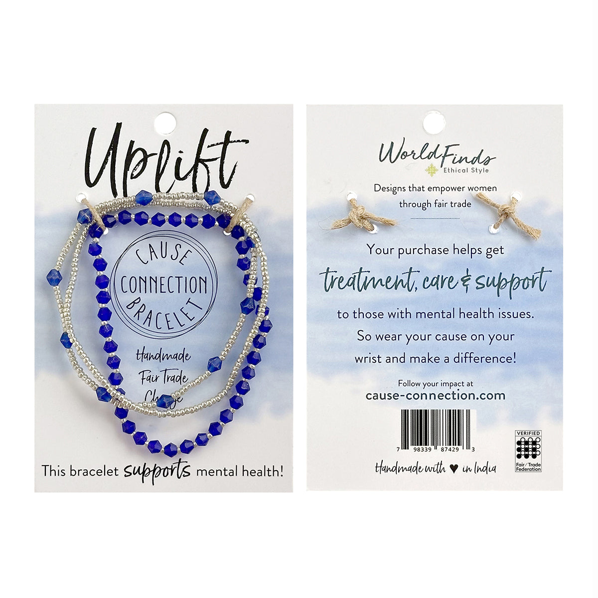 The Uplift bracelet creates goodness on so many levels! Each three-stranded bracelet is handmade by women artisans in India, and it also helps support mental health treatment, support & programs. See below for more information on this donation! Beads are made of glass and a brass/metal mix.