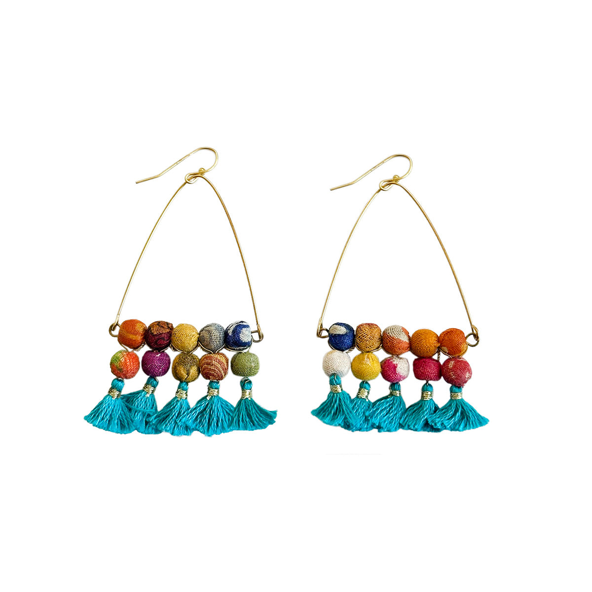A waterfall of turquoise tassels accent two rows of colorful repurposed Kantha textile beads and a gold metallic arch. Exact colors will vary as the Kantha beads are one-of-a-kind.
