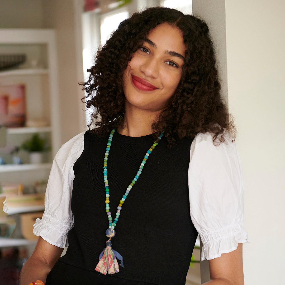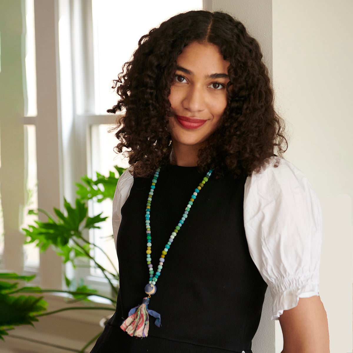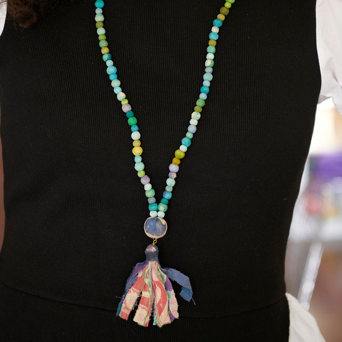 This relaxed style is super casual when worn alone and makes the perfect statement piece when layered. Blue, green & purple beads form a long strand that is finished with a statement bead and tassel. Each piece is made from repurposed Kantha and Sari textiles, so colors and patterns are all one-of-a-kind and will vary.