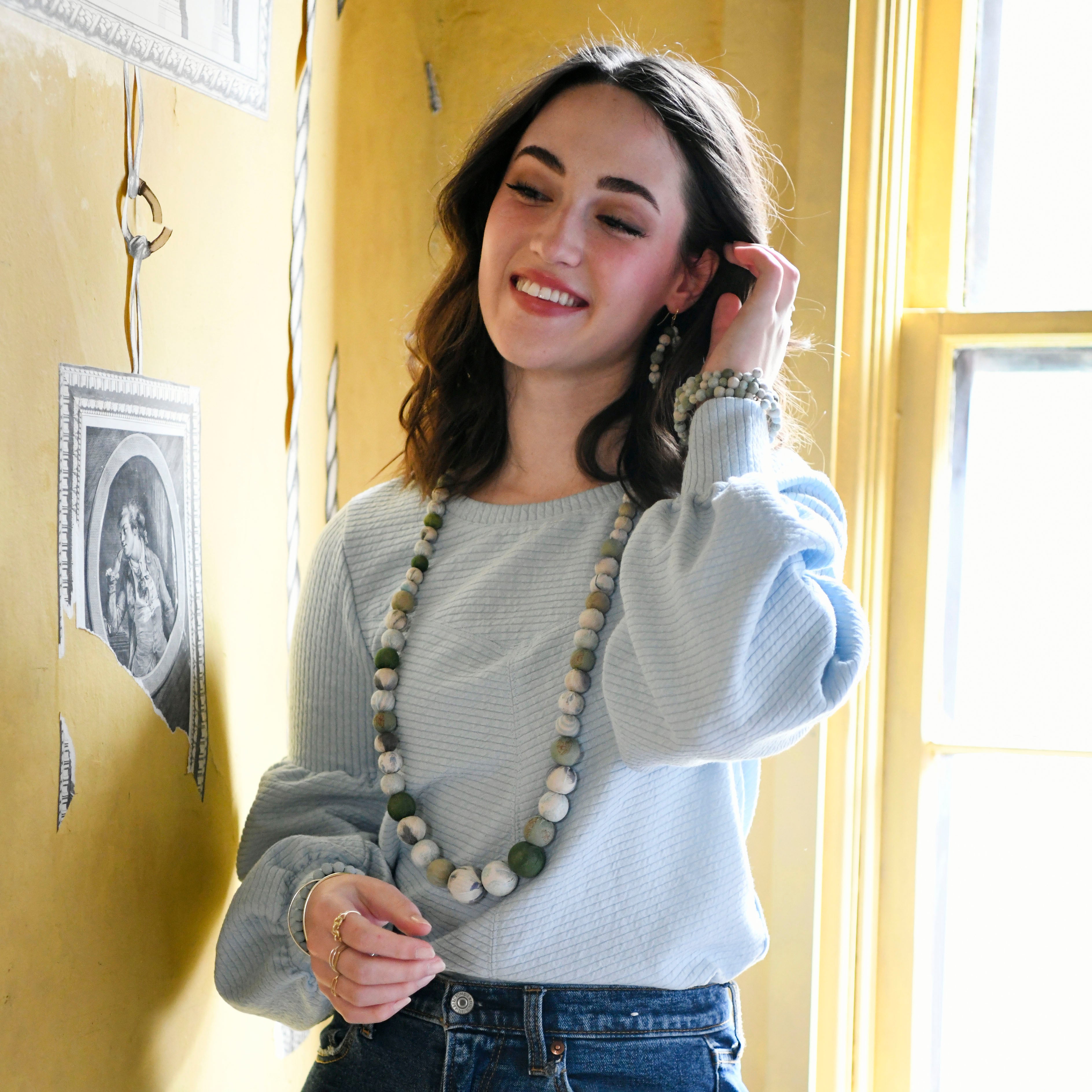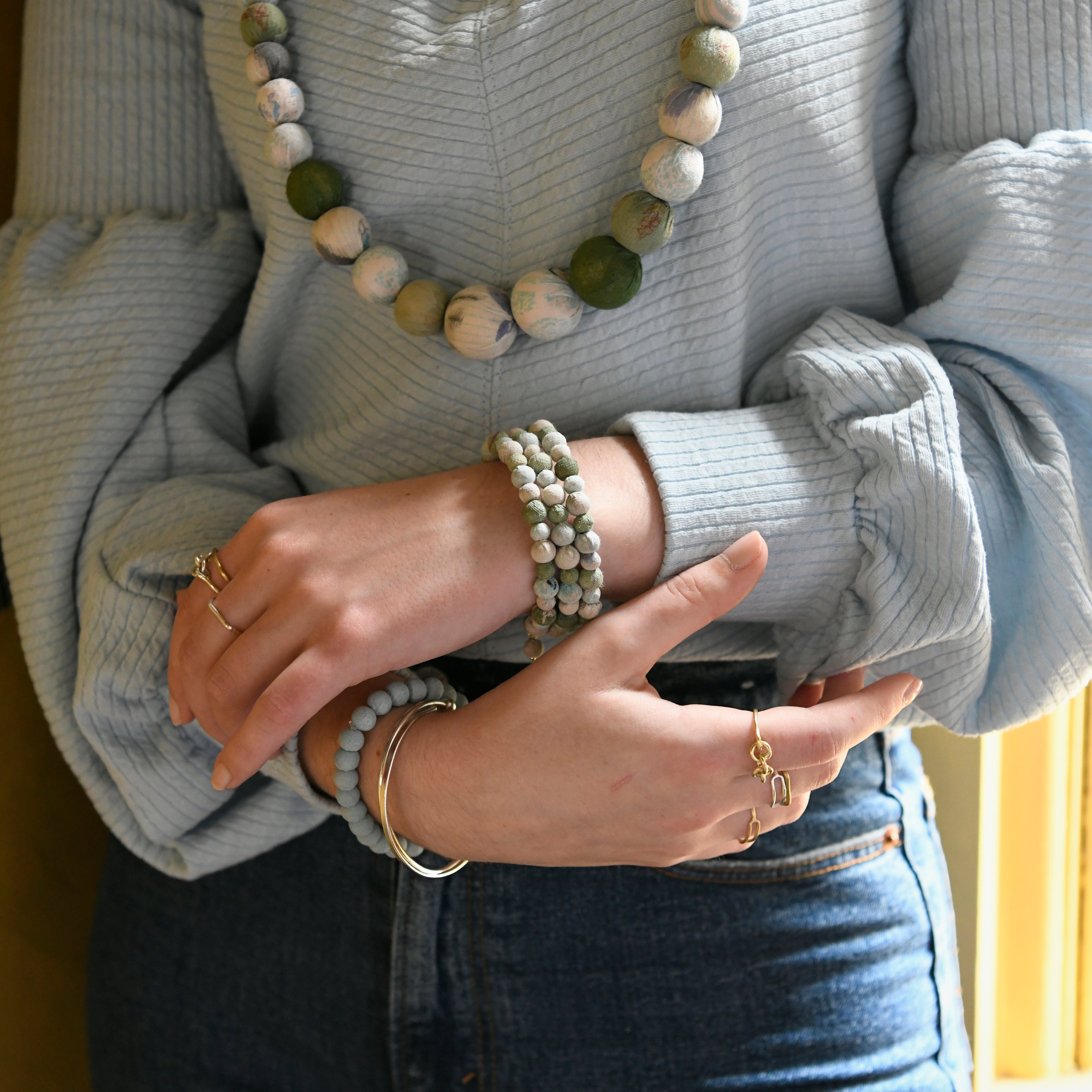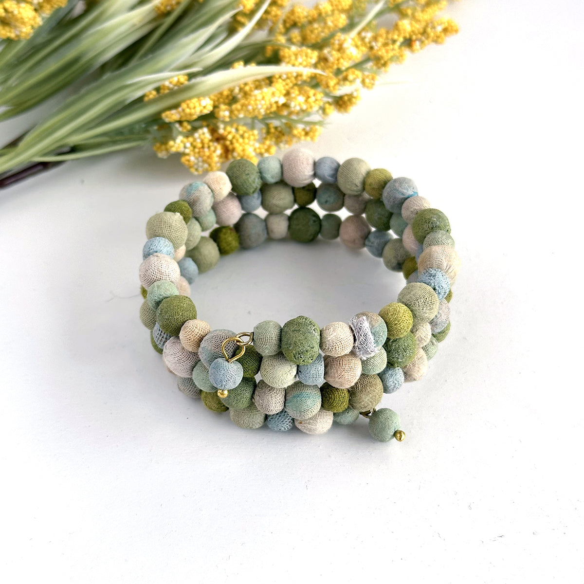 Evoking the sea's beauty, the Kantha Waves Spiral Bracelet features Kantha beads colorized in hues of blue, green, and cream. This bracelet features a coiled memory wire base for an easy fit. Made from upcycled textiles, the beads are carefully sorted from Sari textiles and hues of each bracelet will vary.