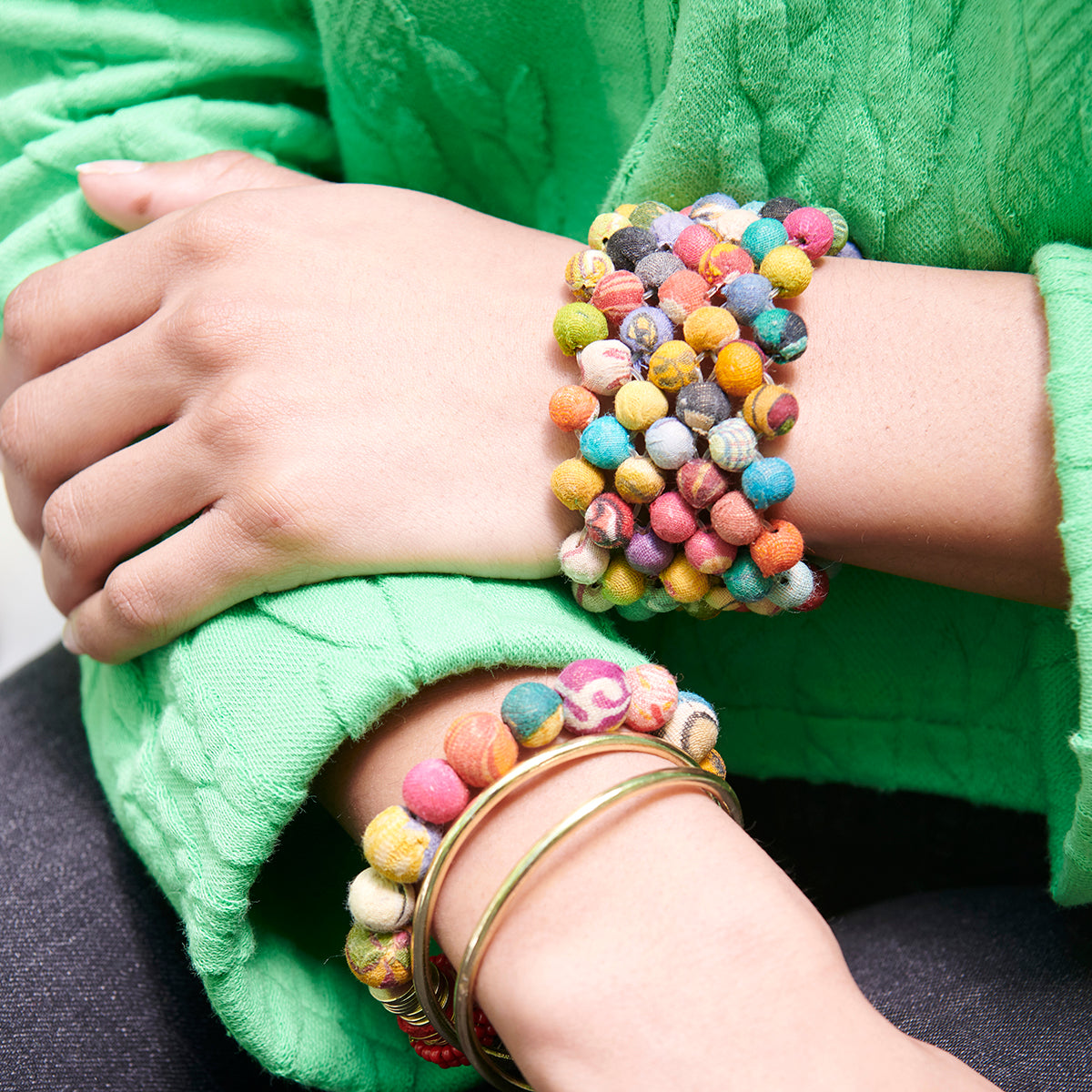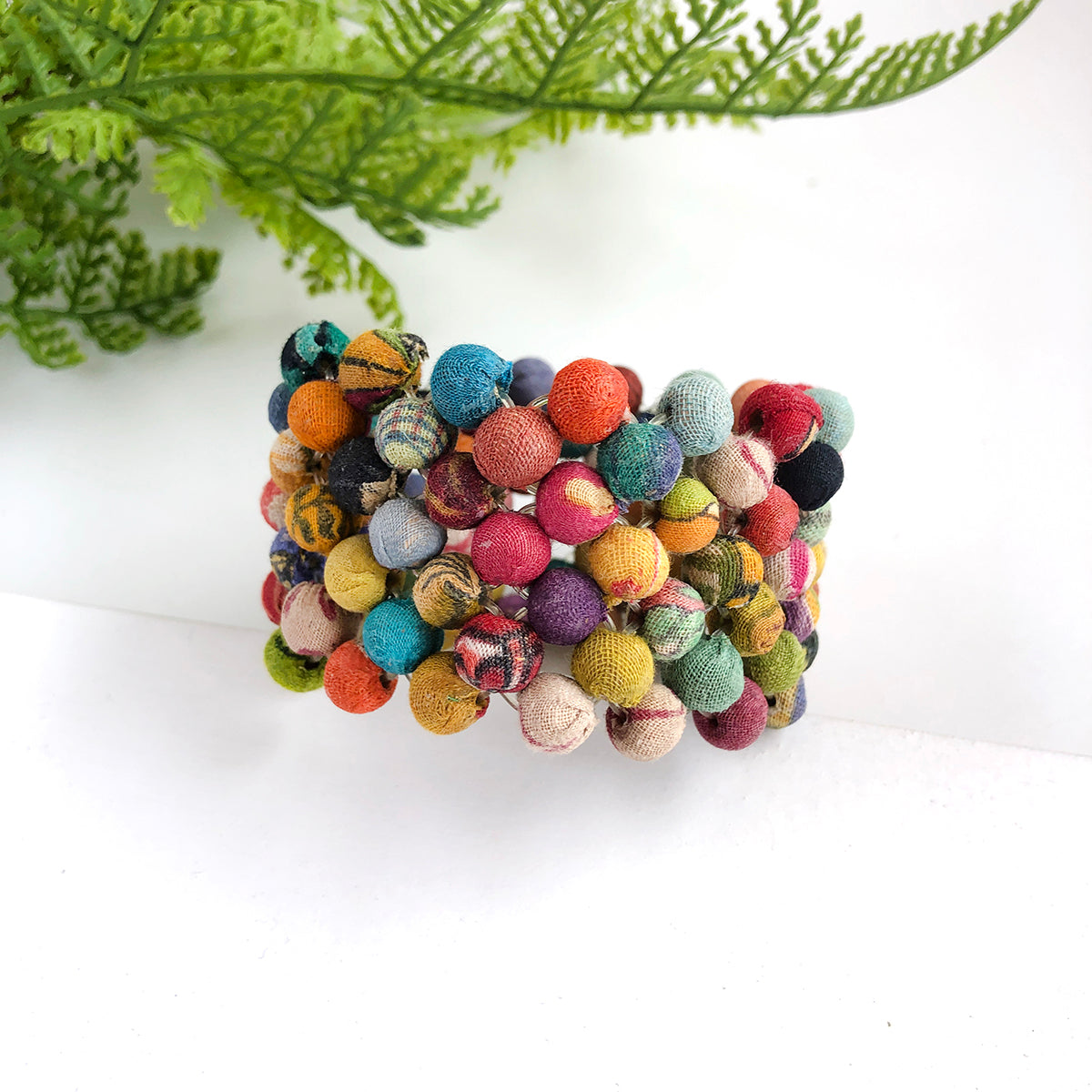 This striking accessory features seven layers of vibrant kantha beads intricately woven to create a dazzling statement bracelet! Handcrafted from upcycled Sari and Kantha fabrics, each bracelet is one-of-a-kind with its own colors and patterns!