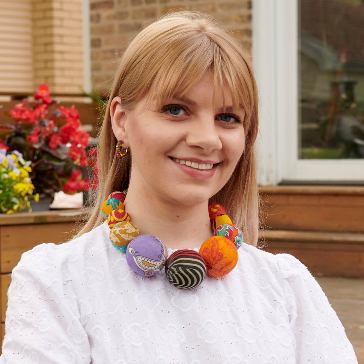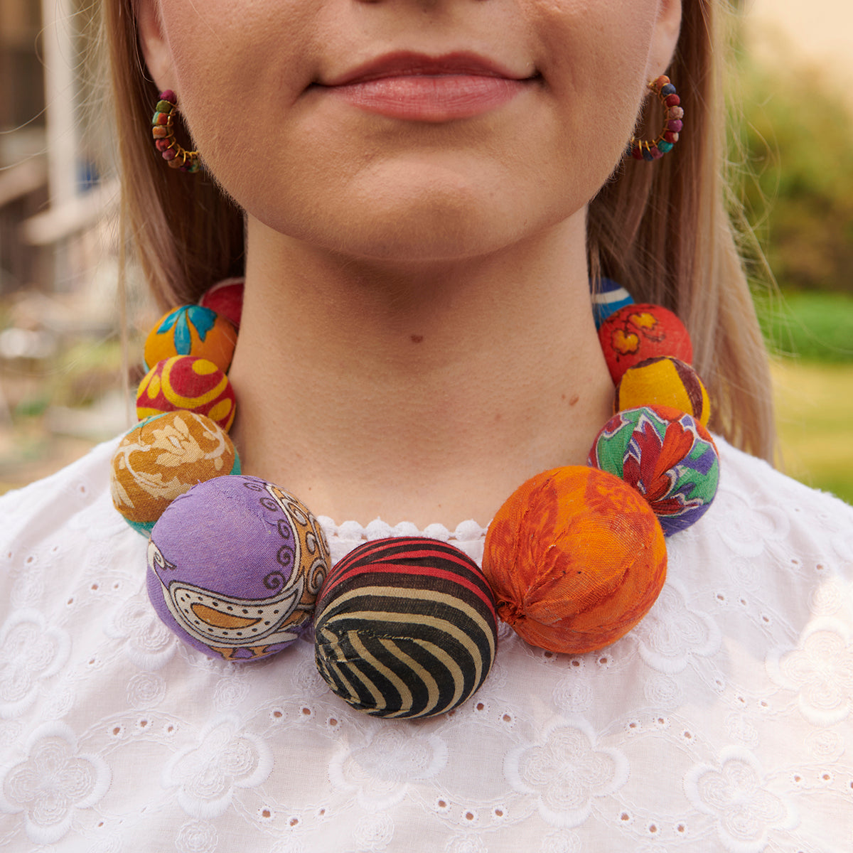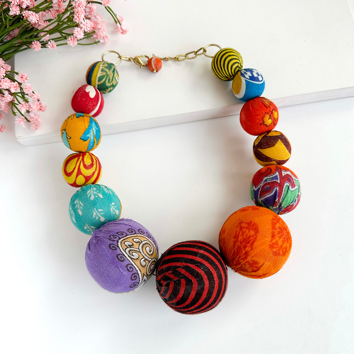 A true statement. The Kantha Gigi Collar Necklace has large, oversized Kantha beads that create a standout necklace like no other! Crafted from repurposed Sari and Kantha fabric, each is one-of-a-kind and exact colors and patterns of the beads will vary.
