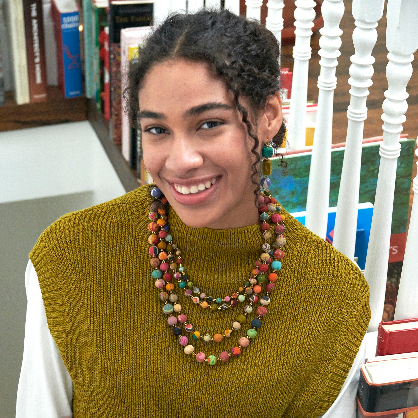 Four strands of vivid textile beads are linked with gilded metal wires for an effortless, polished look. Thoughtfully crafted from repurposed Kantha & Sari textiles; each piece is one-of-a-kind with its own colors and patterns.