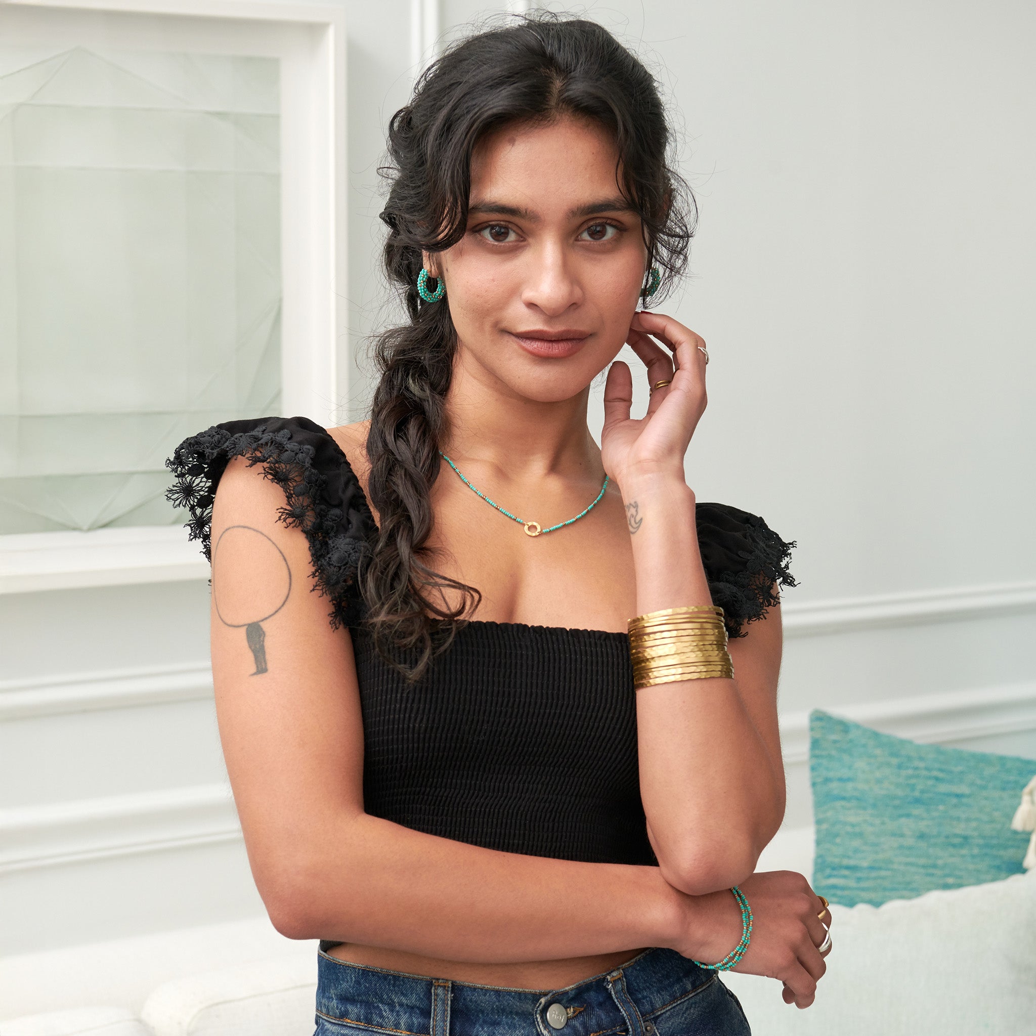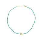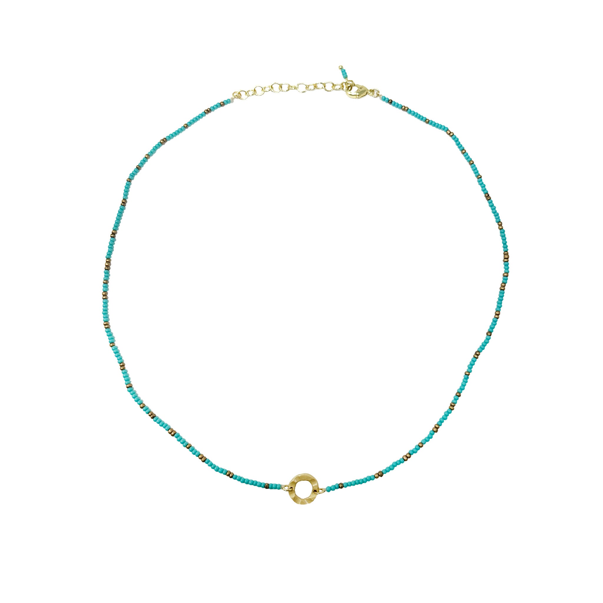 A single strand of teeny tiny turquoise-colored seed beads is highlighted with matte gold beads to create a sun-kissed sea necklace that looks great worn singly or layered with metallic styles.