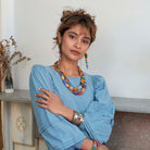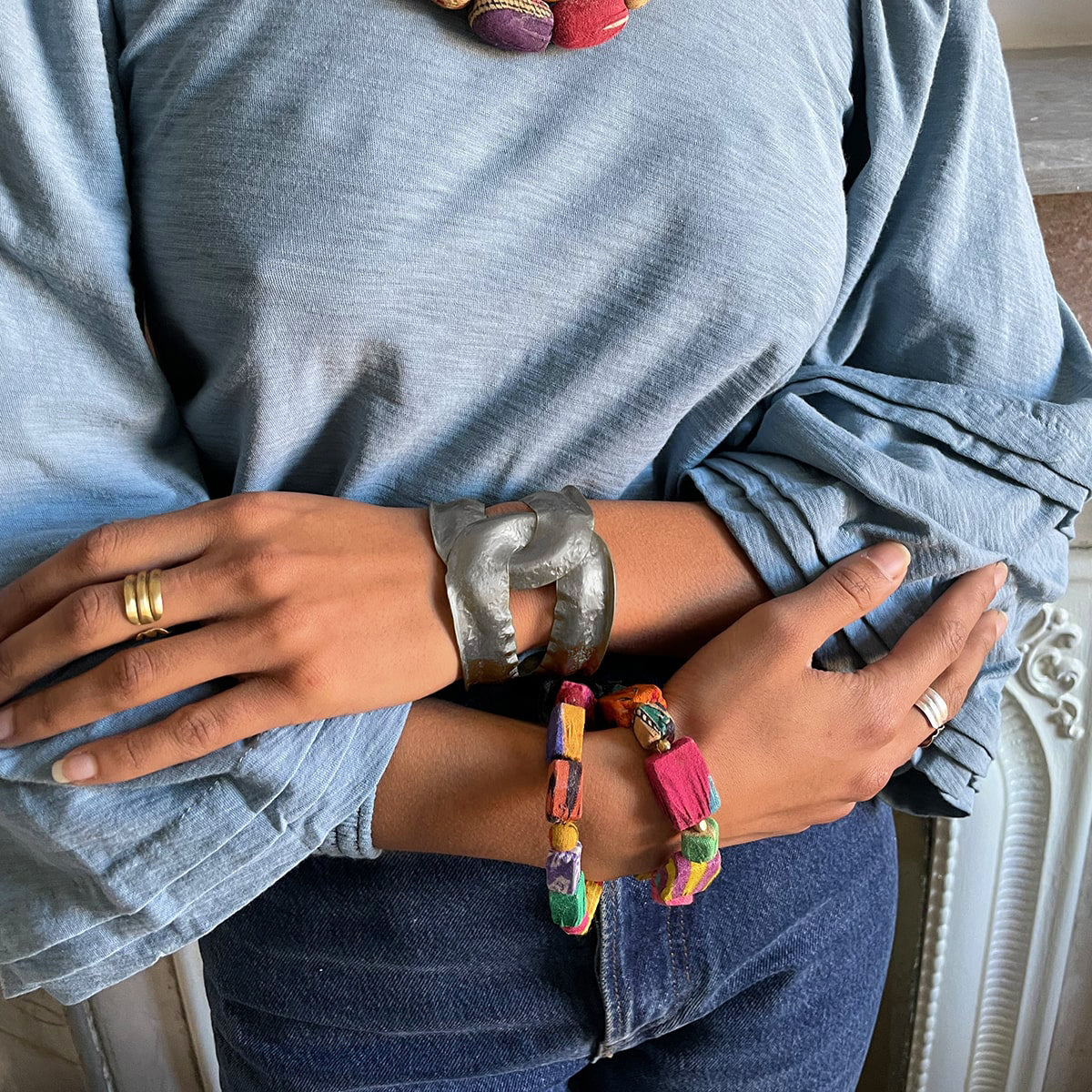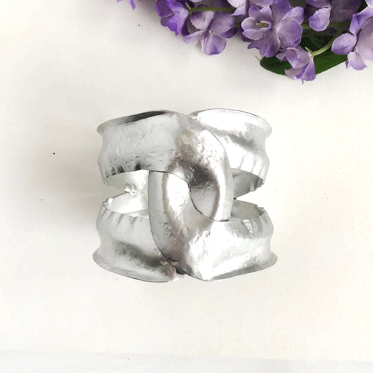This luminous statement style simply commands compliments! Textured satiny metal is hand-formed into this dimensional cuff. The sculptural technique gives it a smooth, rounded outer edge and cinched detail on the inner edges. The interlinked center provides a fabulous focal point, while the overall aesthetic is reminiscent of a found object from an ancient land.