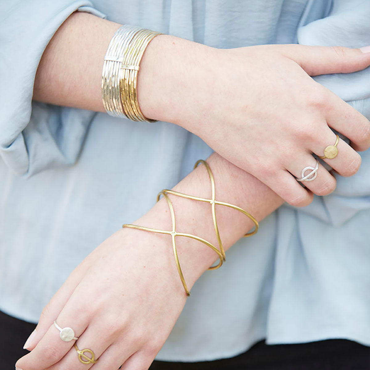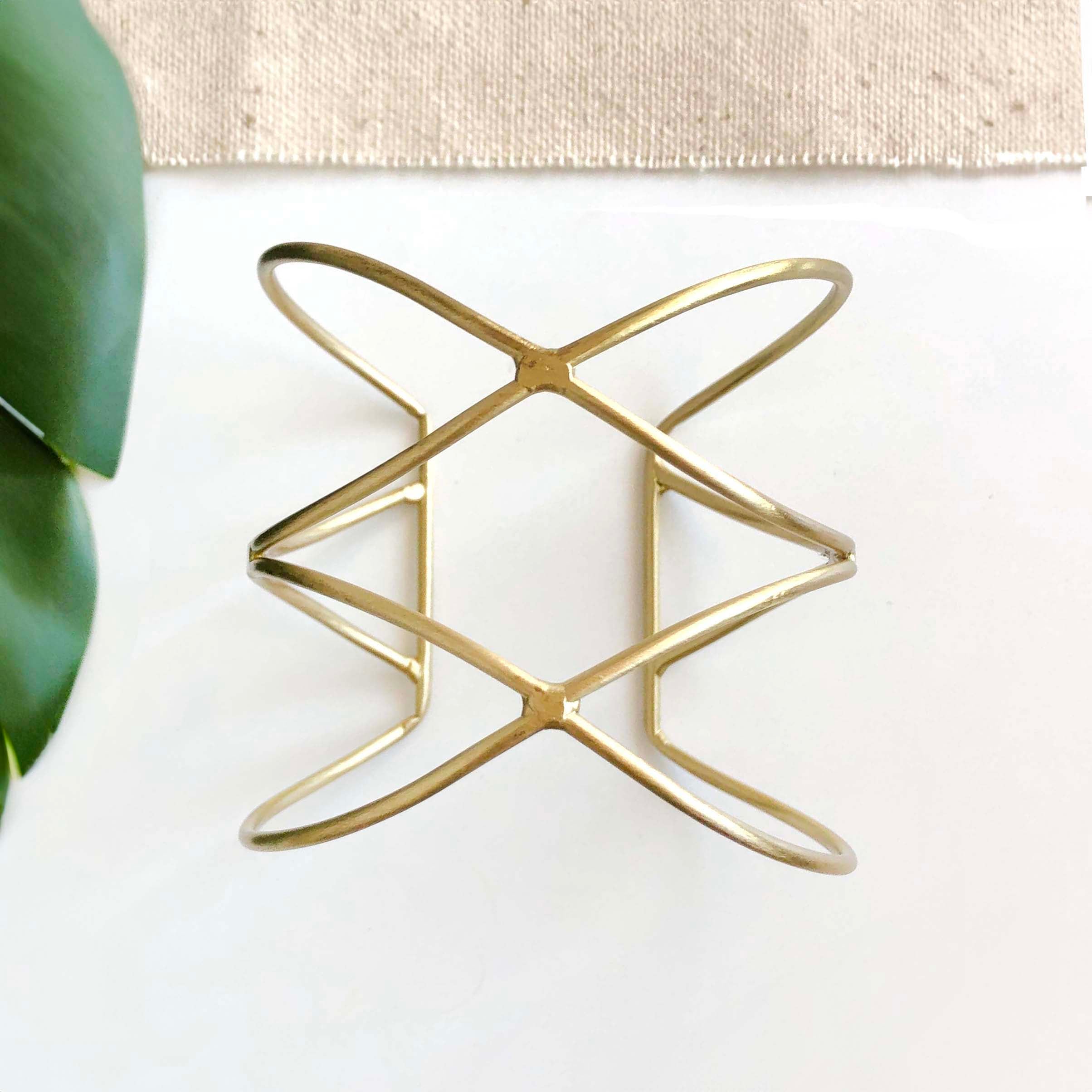 Make a style statement with this bold architectural cuff featuring crossed matte metal wires.