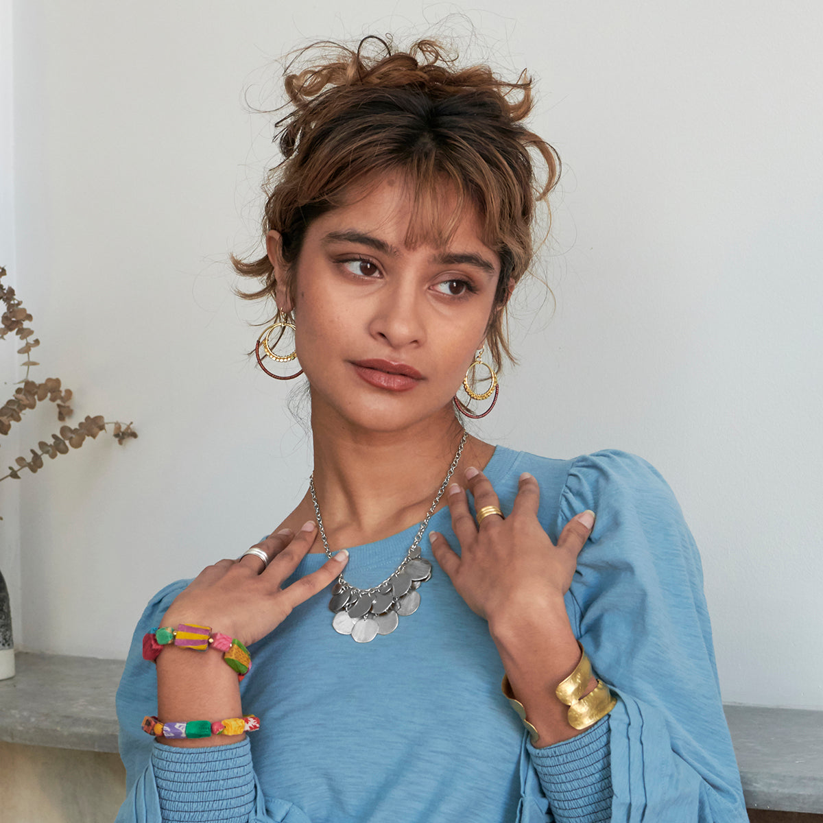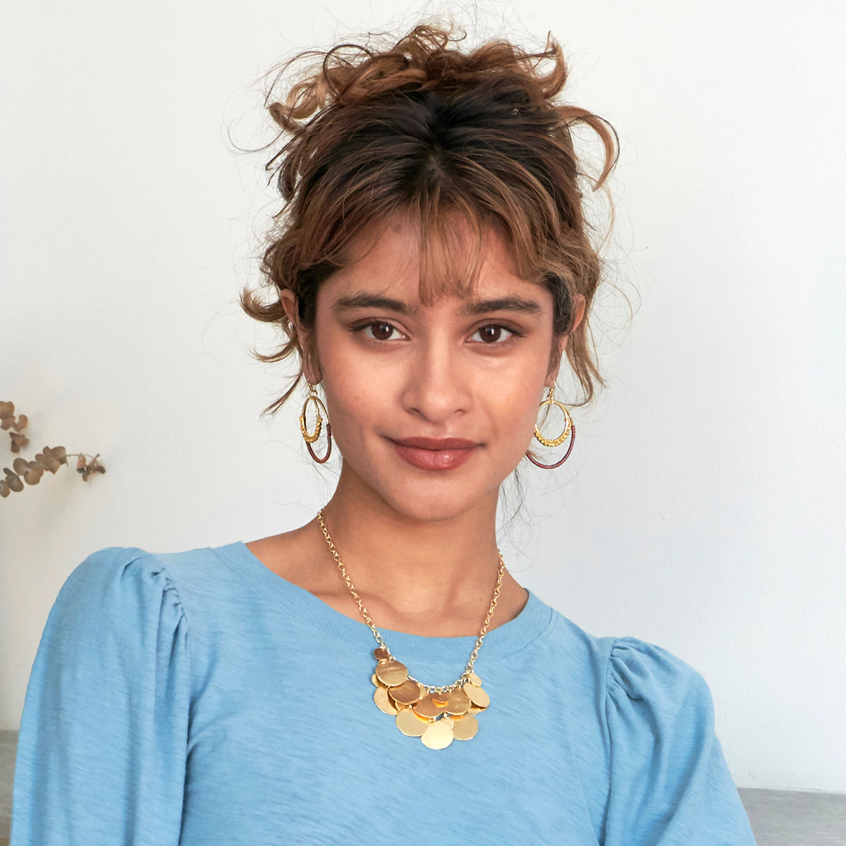 Layers of large and small handcrafted gold metal discs overlap and cascade down this glimmering pendant necklace. A perfect statement piece.