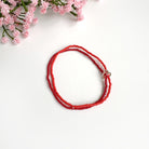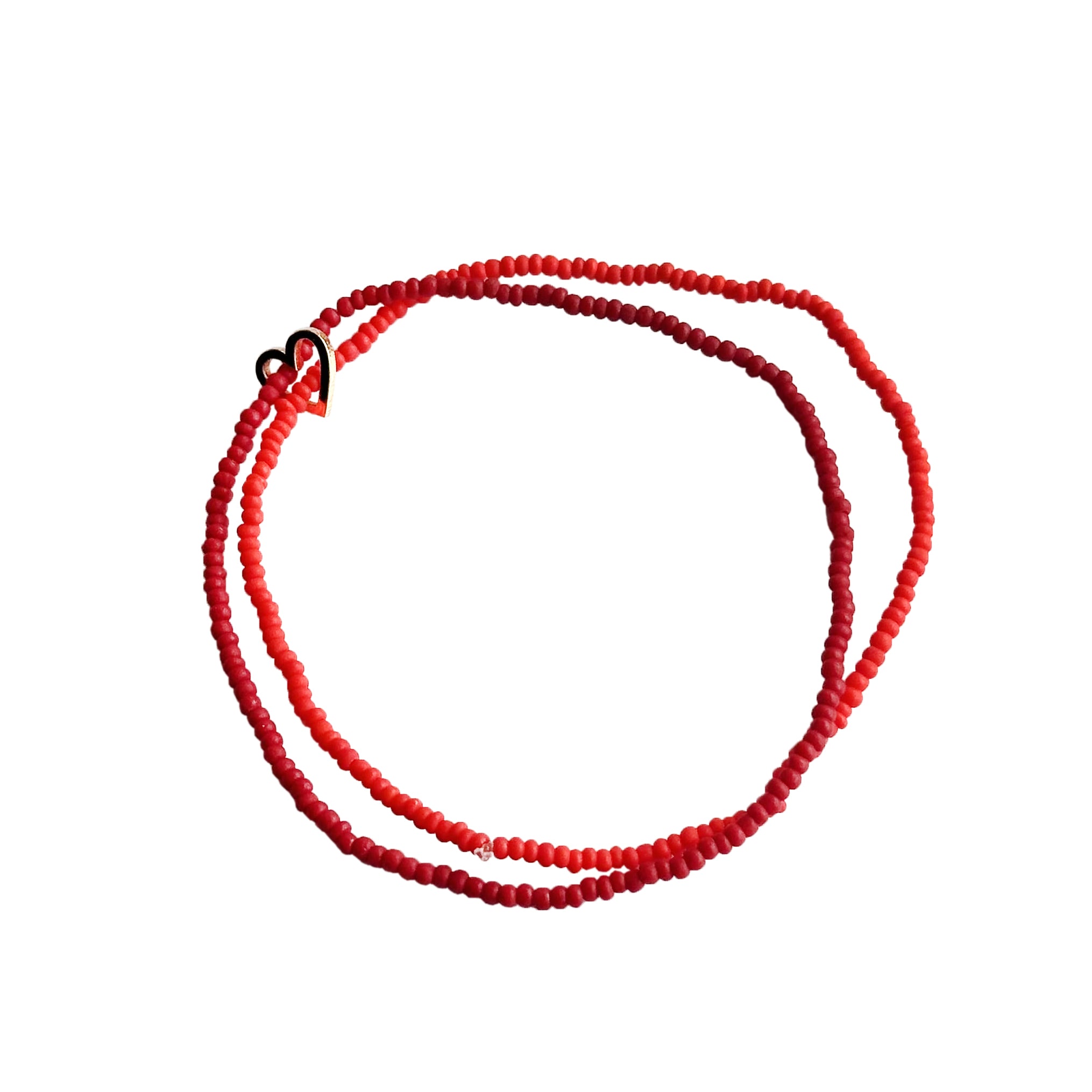 It features two strands of deep red and bright red seed beads, beautifully united by a 24K gold-plated heart charm. Lovingly handmade by women artisans in India.