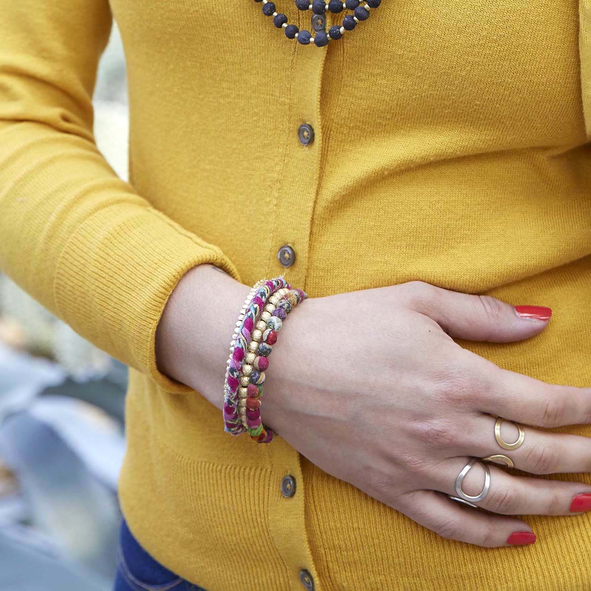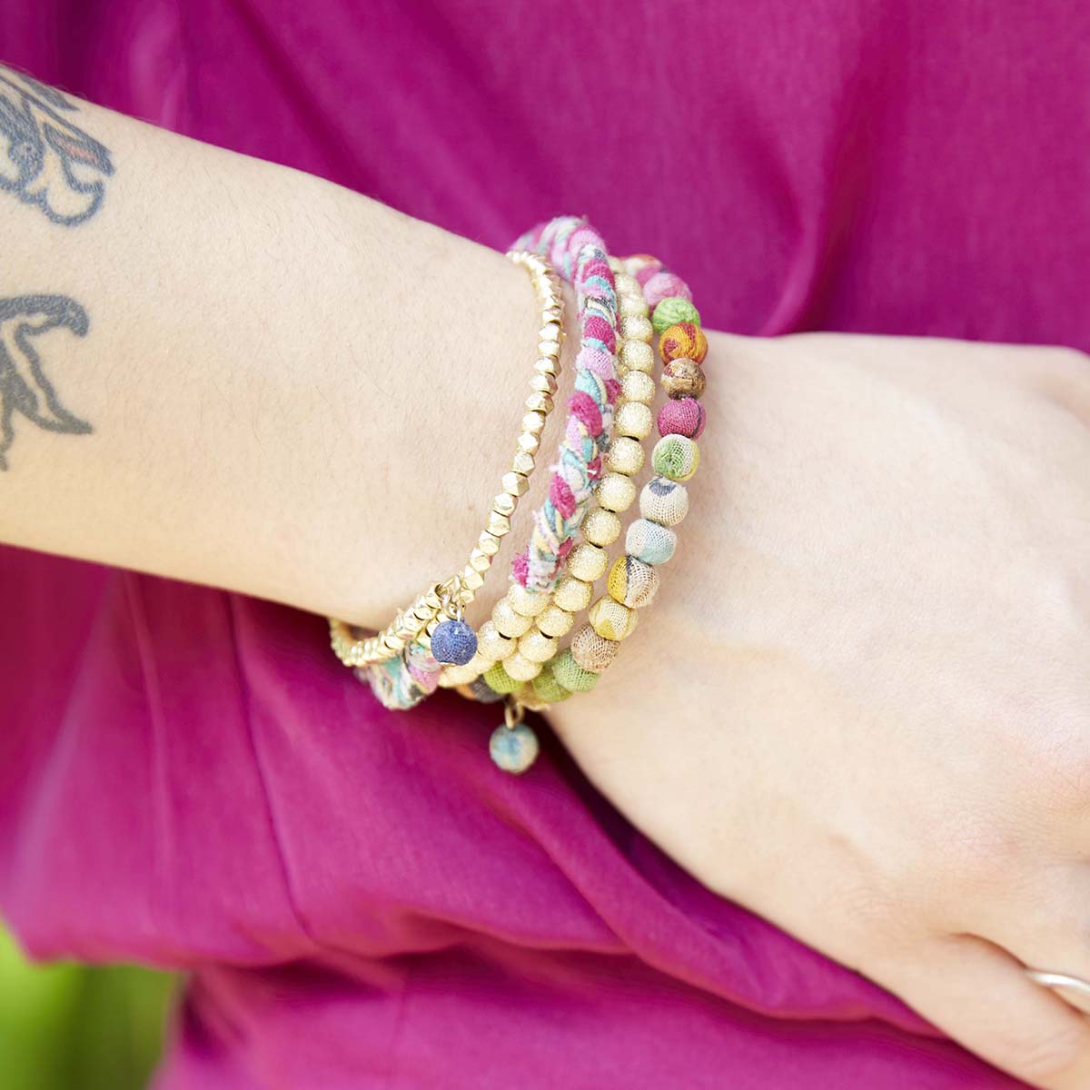 A vibrant mix of upcycled Kantha textile beads, gold accents, and a woven textiles make this captivating jewelry style. Each piece is crafted from recycled Kantha fabric, boasting unique hues and prints.
