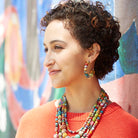 Colorful round Kantha beads graduate from large to small as they curl to reach their metallic posts.