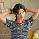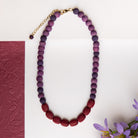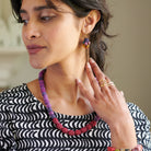 Your new favorite pairing, this colorized Kantha collection matches up complimentary shades for a fresh arrangement. A chain of round beads in Purple is interrupted by a grouping of oval beads in Burgundy to form the centered pendant portion. Looks great alone or layered with the other two Couplet Necklaces, or the color-blocked styles in our Prism Collection. Crafted from upcycled textiles, no two are exactly alike.