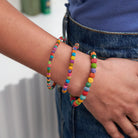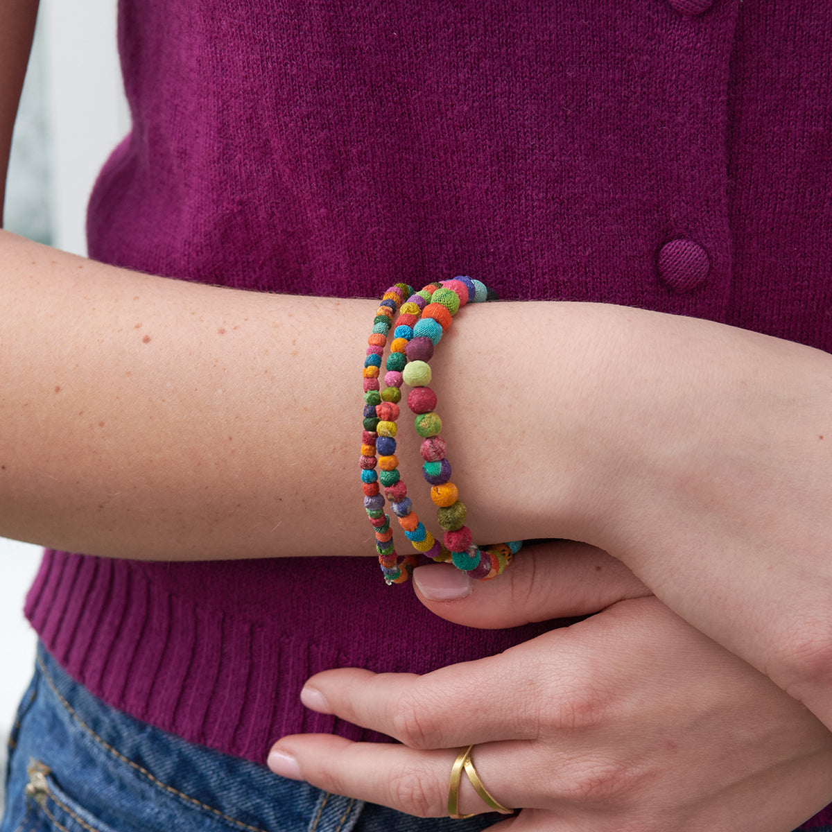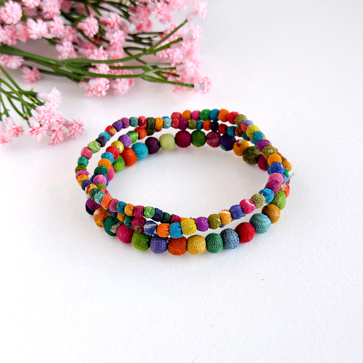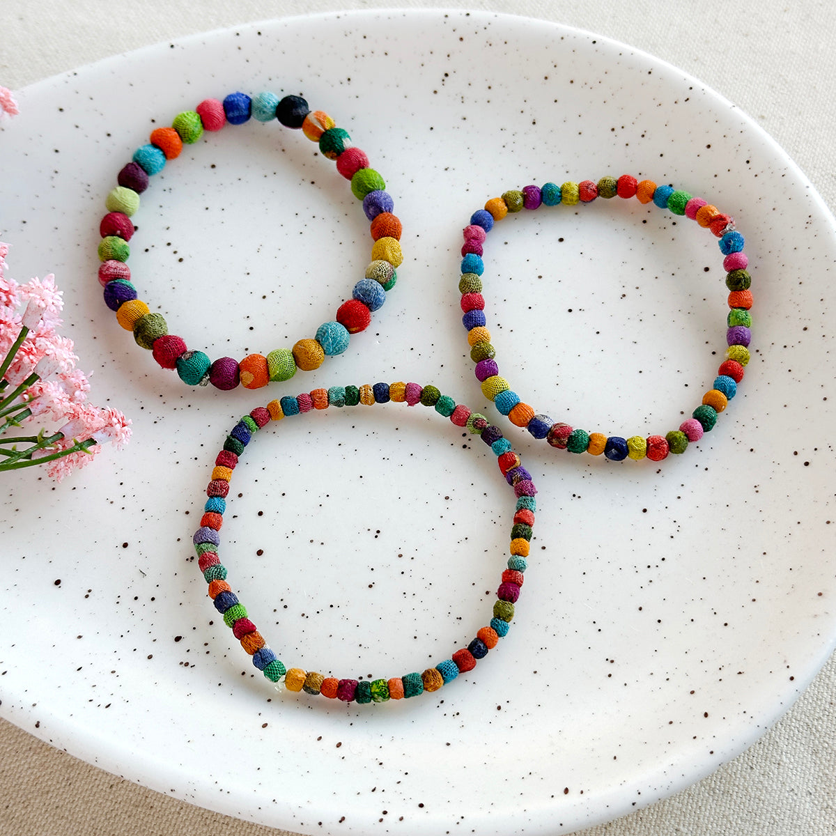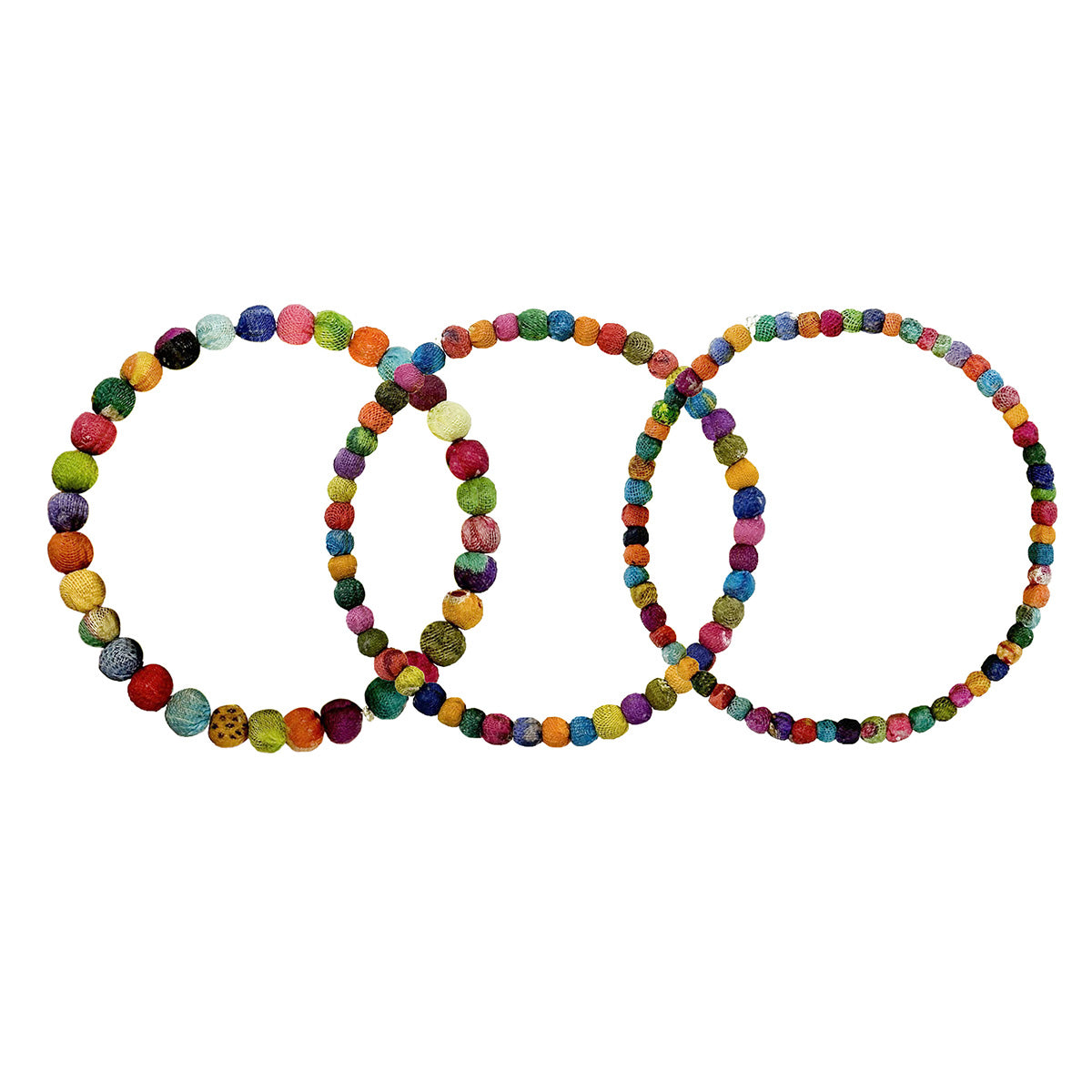 This set of 3 bracelets has you covered! The smallest strand is made from our tiniest Milieu beads, and the beads of the medium and large strands each increase slightly in size. Wear them together for a layered look, or wear them singly for a subtle pop of color. They’re crafted from reclaimed Sari and Kantha textiles, so each bracelet's color is slightly different.