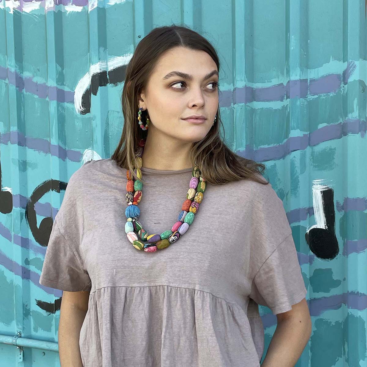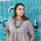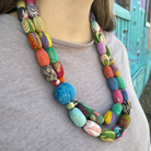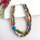 You'll turn heads when wearing the Kantha Focal Necklace. A large, asymmetrically-positioned Kantha statement bead anchors two nestled strands of oval-shaped Kantha beads to form a fabulous statement piece.