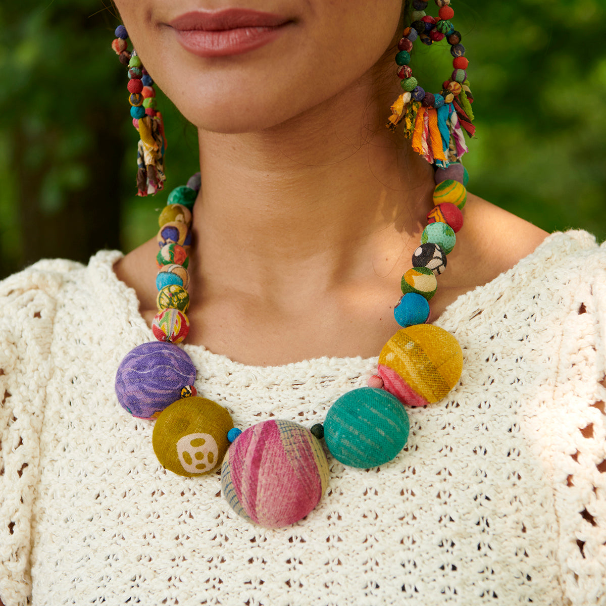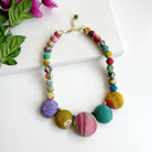 Five super-large Kantha-covered beads have been sliced in half to create a unique statement necklace. The standout dome-shaped center beads are interspersed with tiny beads, and connected to a strand of medium-sized beads for a multi-dimensional look of color and pattern. Each piece one of a kind and colors will vary.