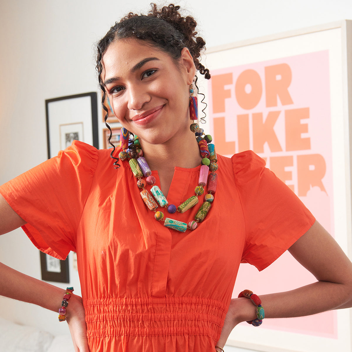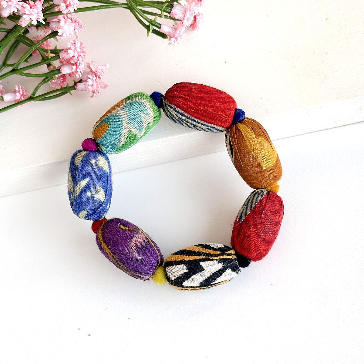 Elongated oval-shaped Kantha beads are separated by colorful pom-poms to form a bold strand of color and texture. Coordinates with our best-selling Kantha Kaleidoscope Necklace. Crafted from repurposed Sari and Kantha fabric, the colorful beads are all one-of-a-kind.