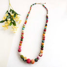 A long strand of colorful, round Kantha beads gradually increases as it reaches the center. Looks great alone or layered. Each piece is made from recycled Kantha textiles, so colors and patterns are all one-of-a-kind and will vary.